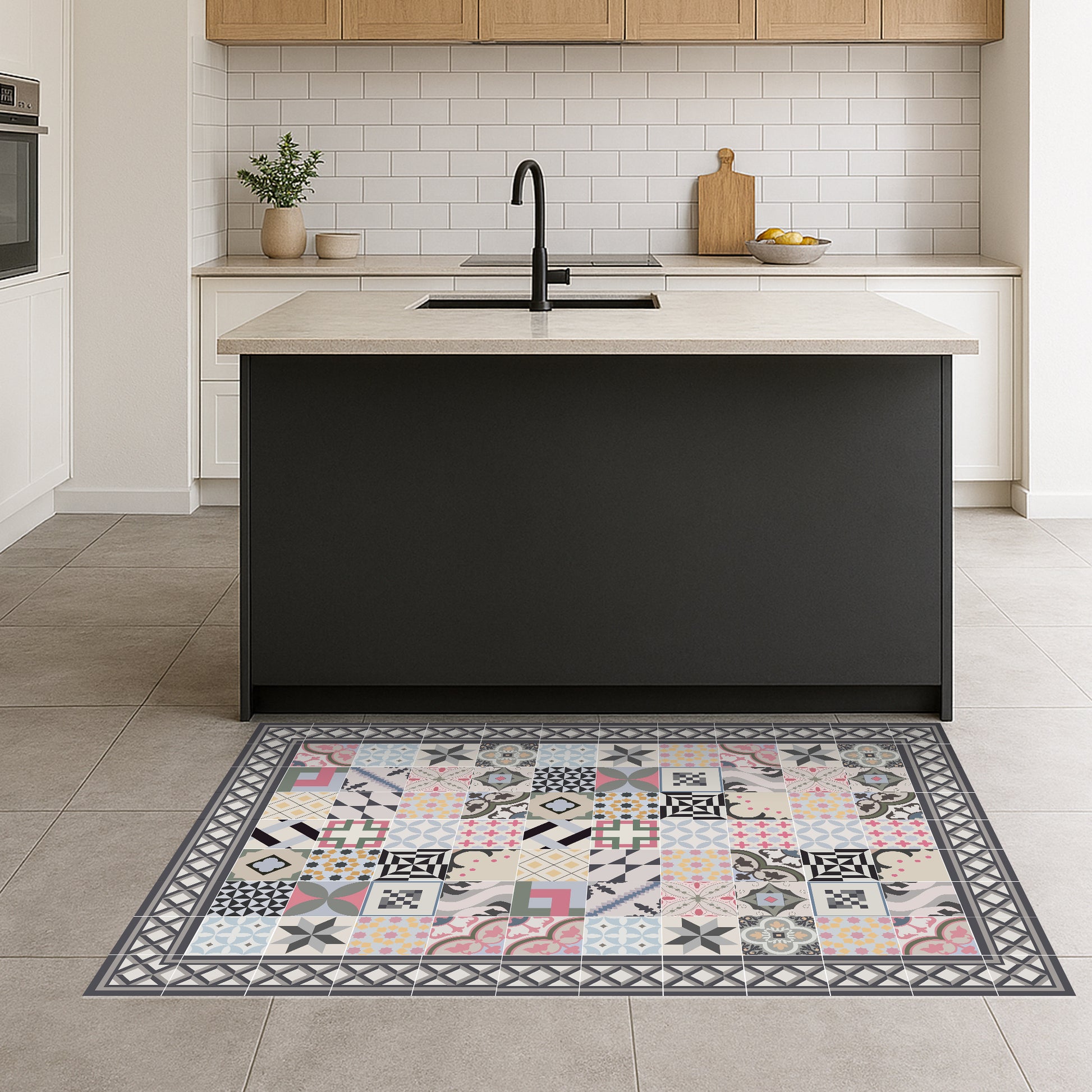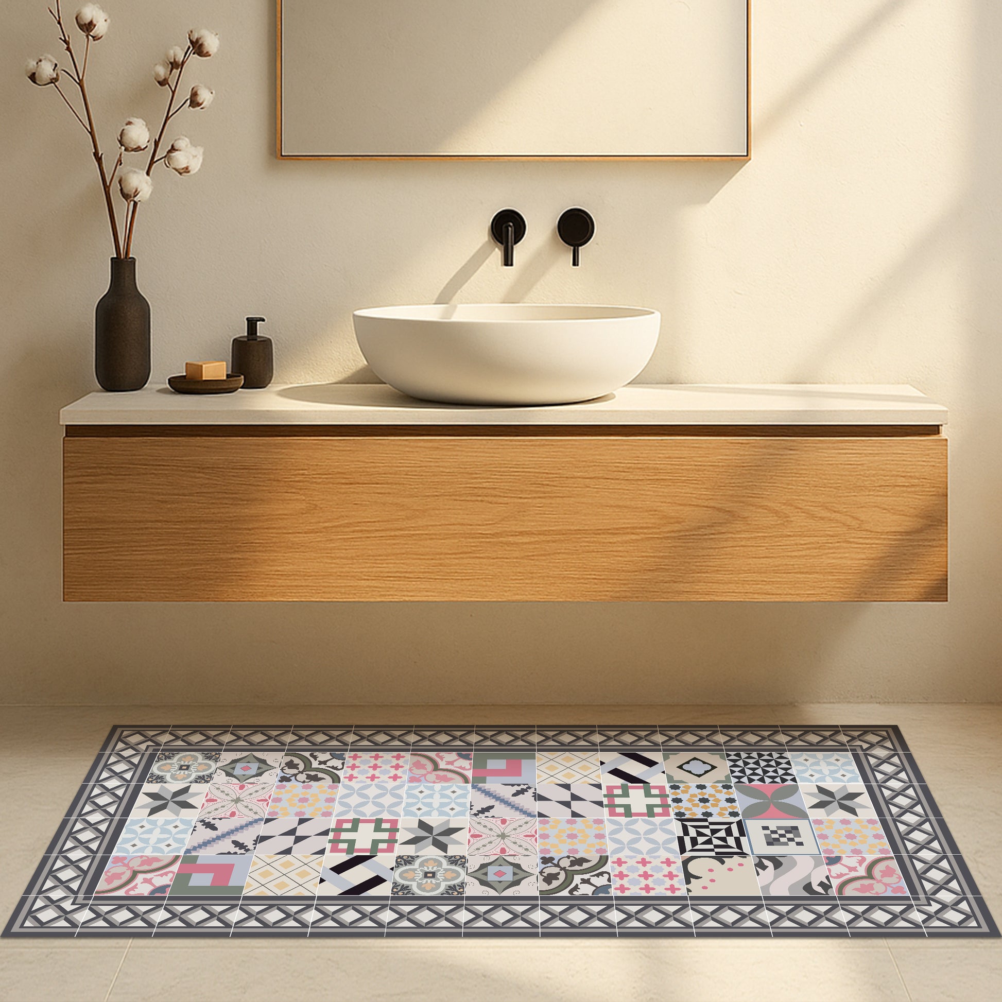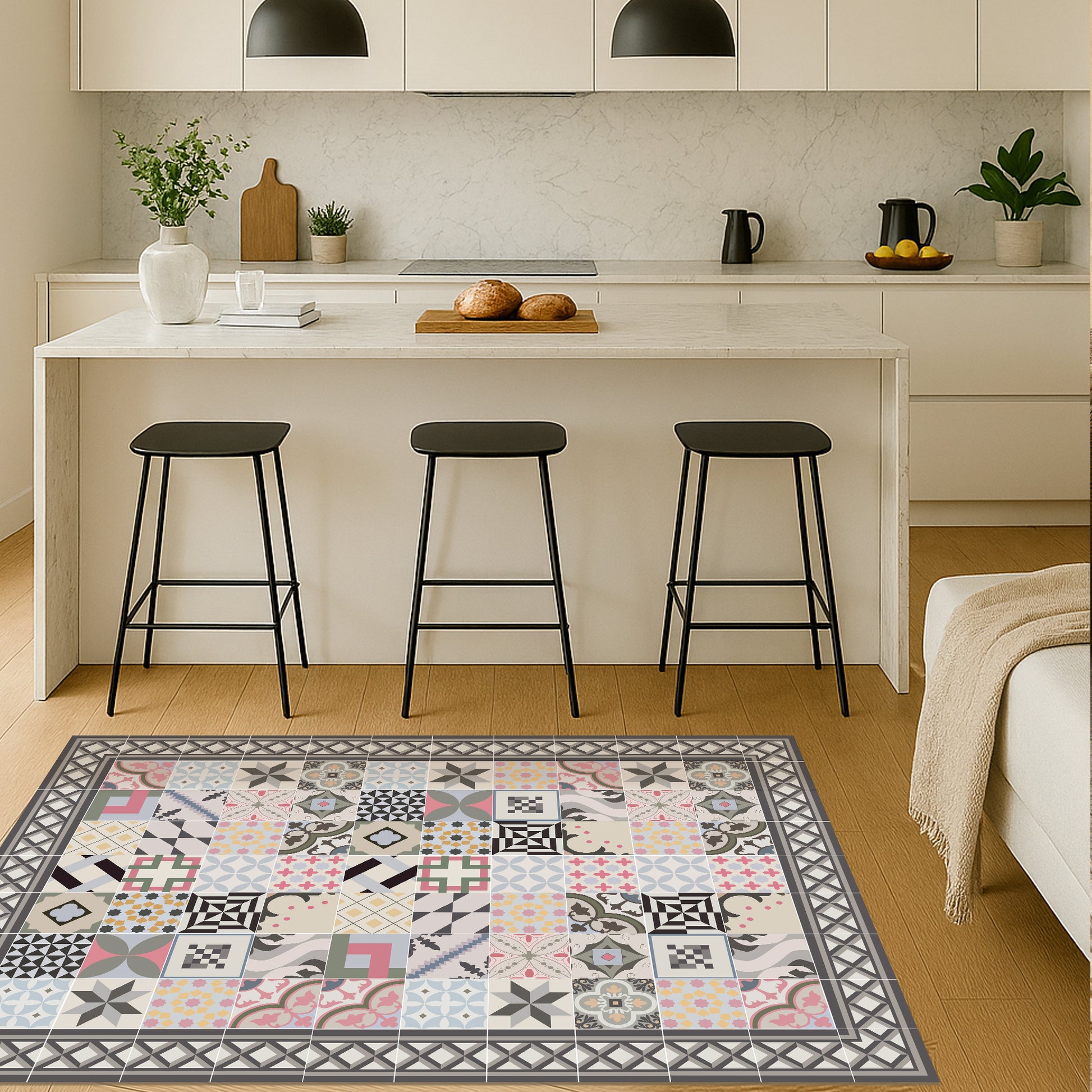 Our rugs are not made of fabric, but of high-quality and durable vinyl. Vinyl is a synthetic material known for its strength and versatility . Unlike traditional fabric rugs, vinyl rugs offer high-fidelity photographic printing , recreating natural textures with astonishing precision, such as jute, wood or marble.