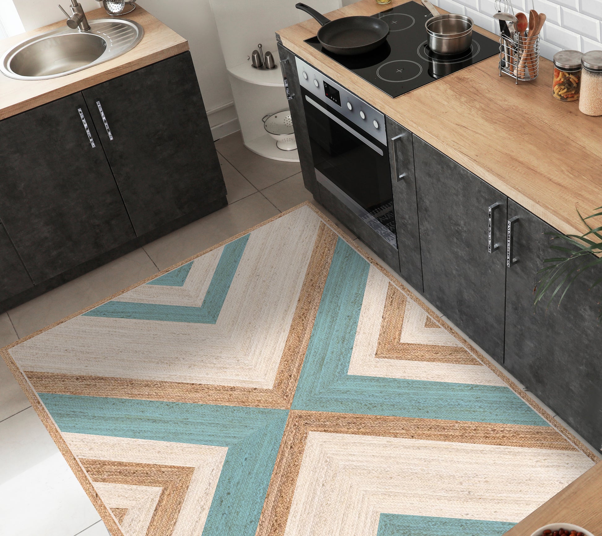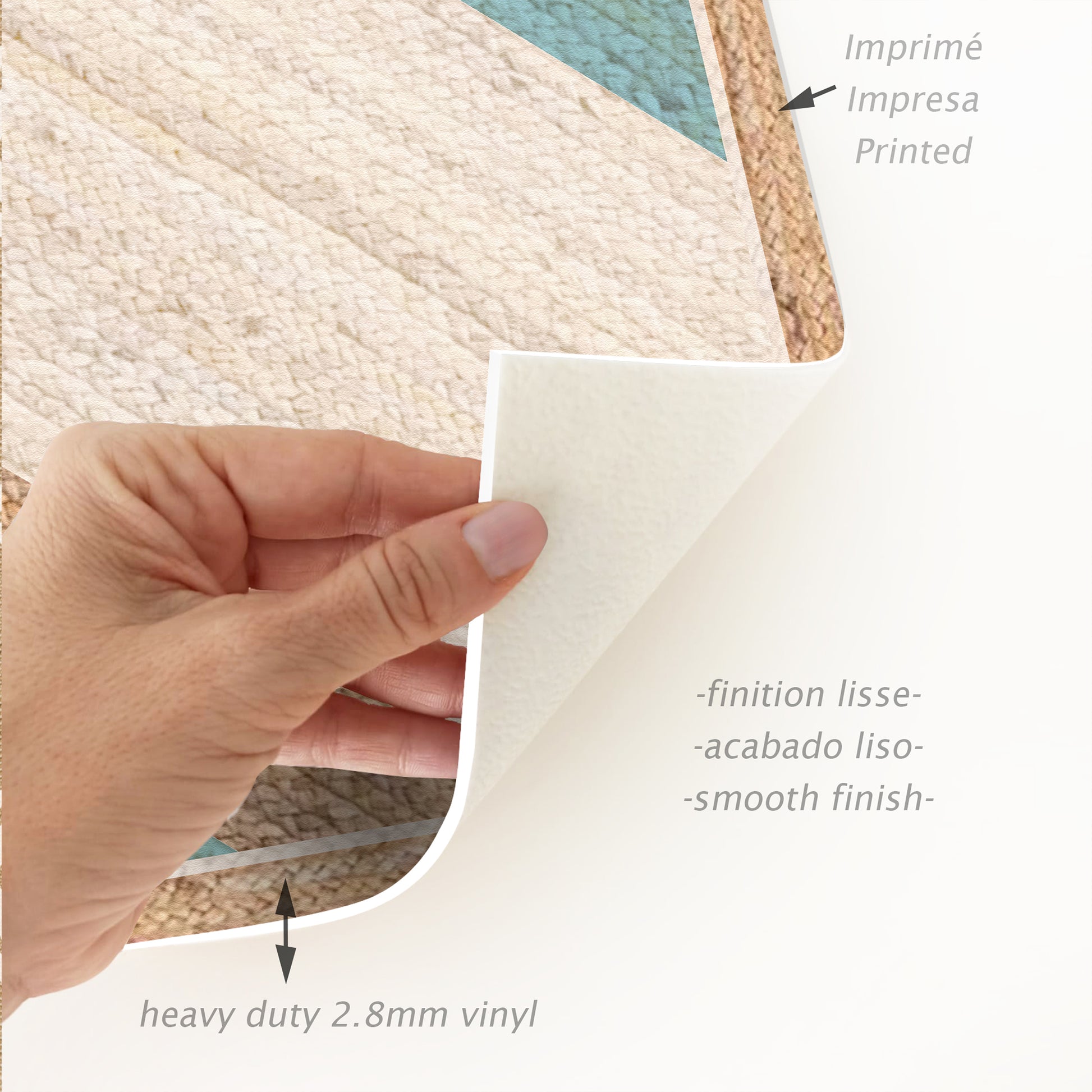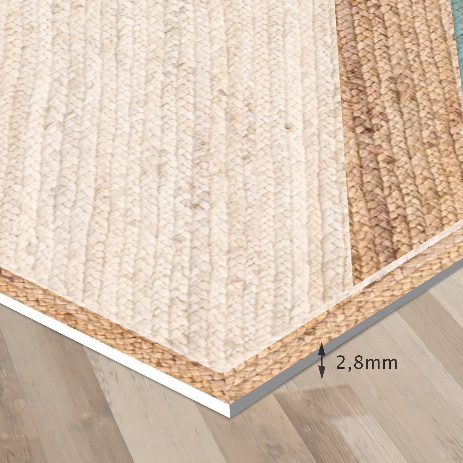 Our rugs are not made of fabric, but of high-quality and durable vinyl. Vinyl is a synthetic material known for its strength and versatility . Unlike traditional fabric rugs, vinyl rugs offer high-fidelity photographic printing , recreating natural textures with astonishing precision, such as jute, wood or marble.