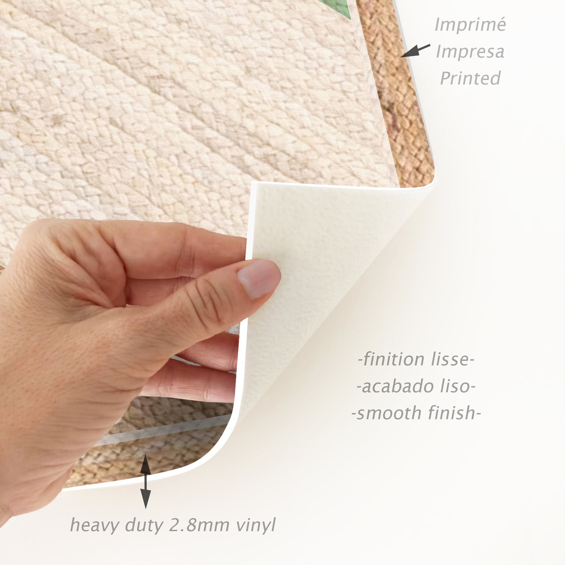 Our rugs are not made of fabric, but of high-quality and durable vinyl. Vinyl is a synthetic material known for its strength and versatility . Unlike traditional fabric rugs, vinyl rugs offer high-fidelity photographic printing , recreating natural textures with astonishing precision, such as jute, wood or marble.