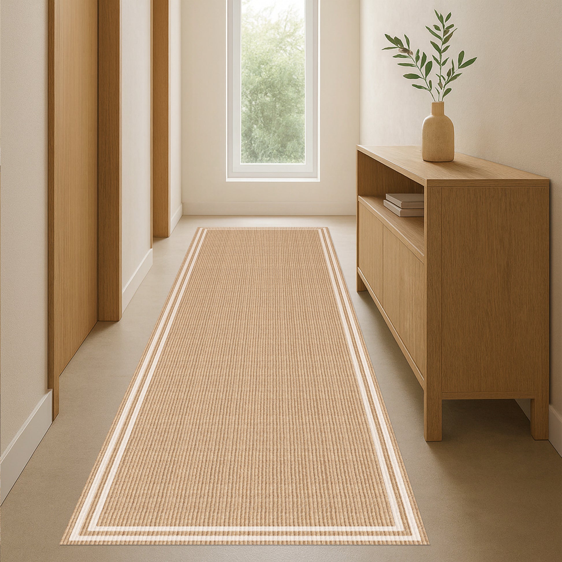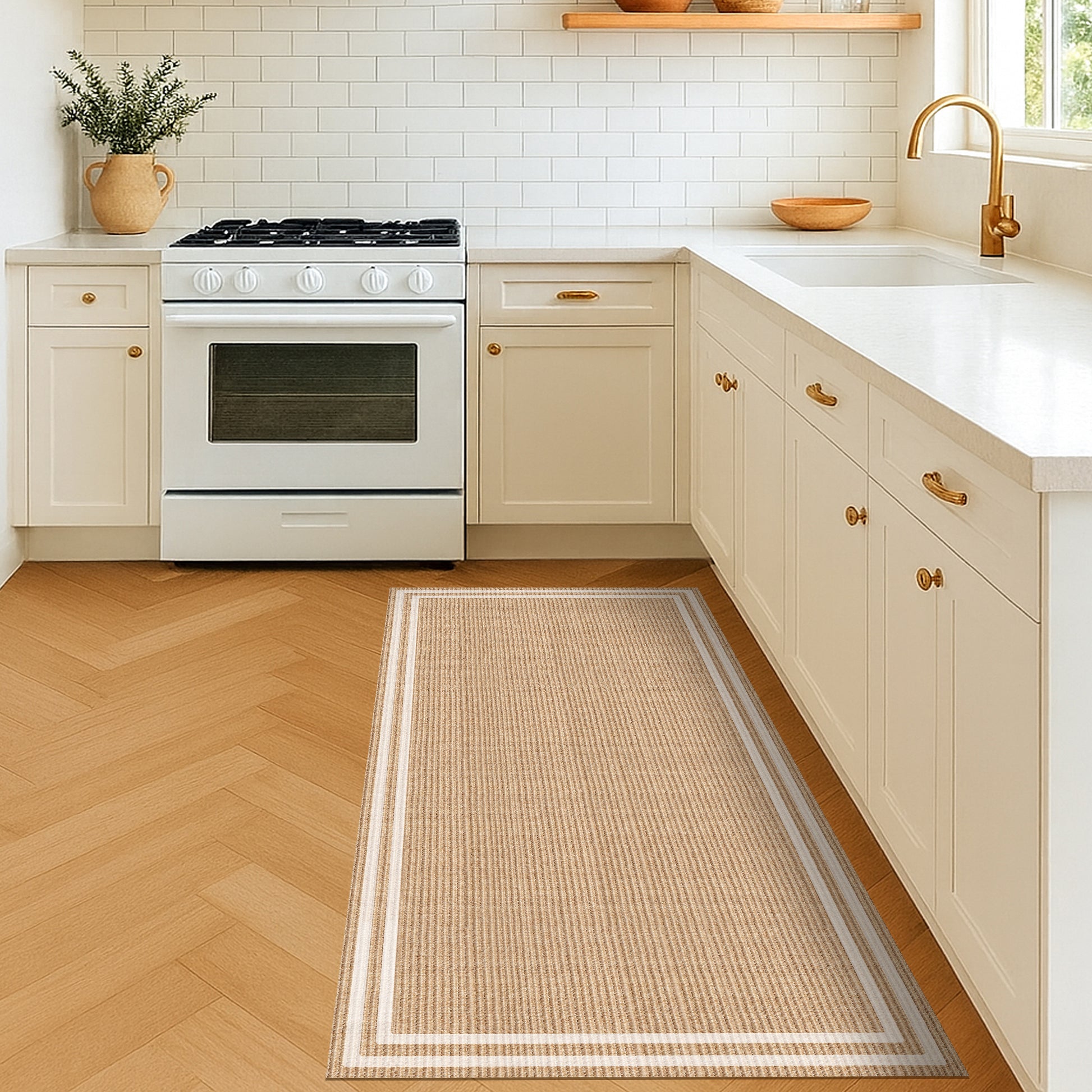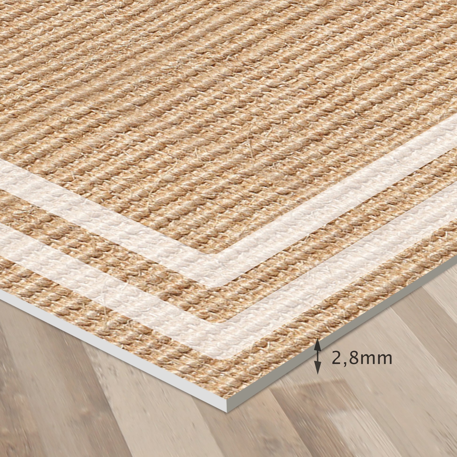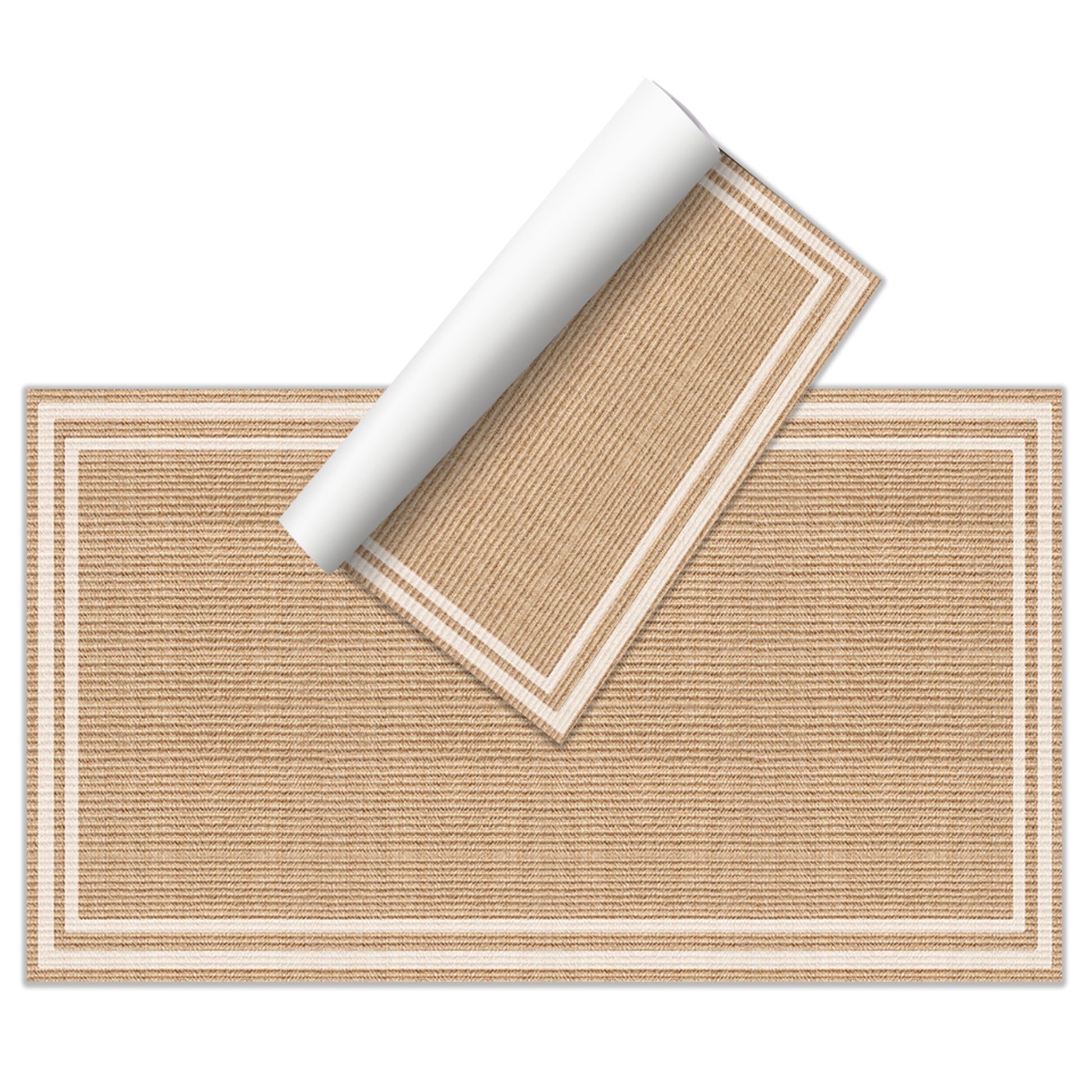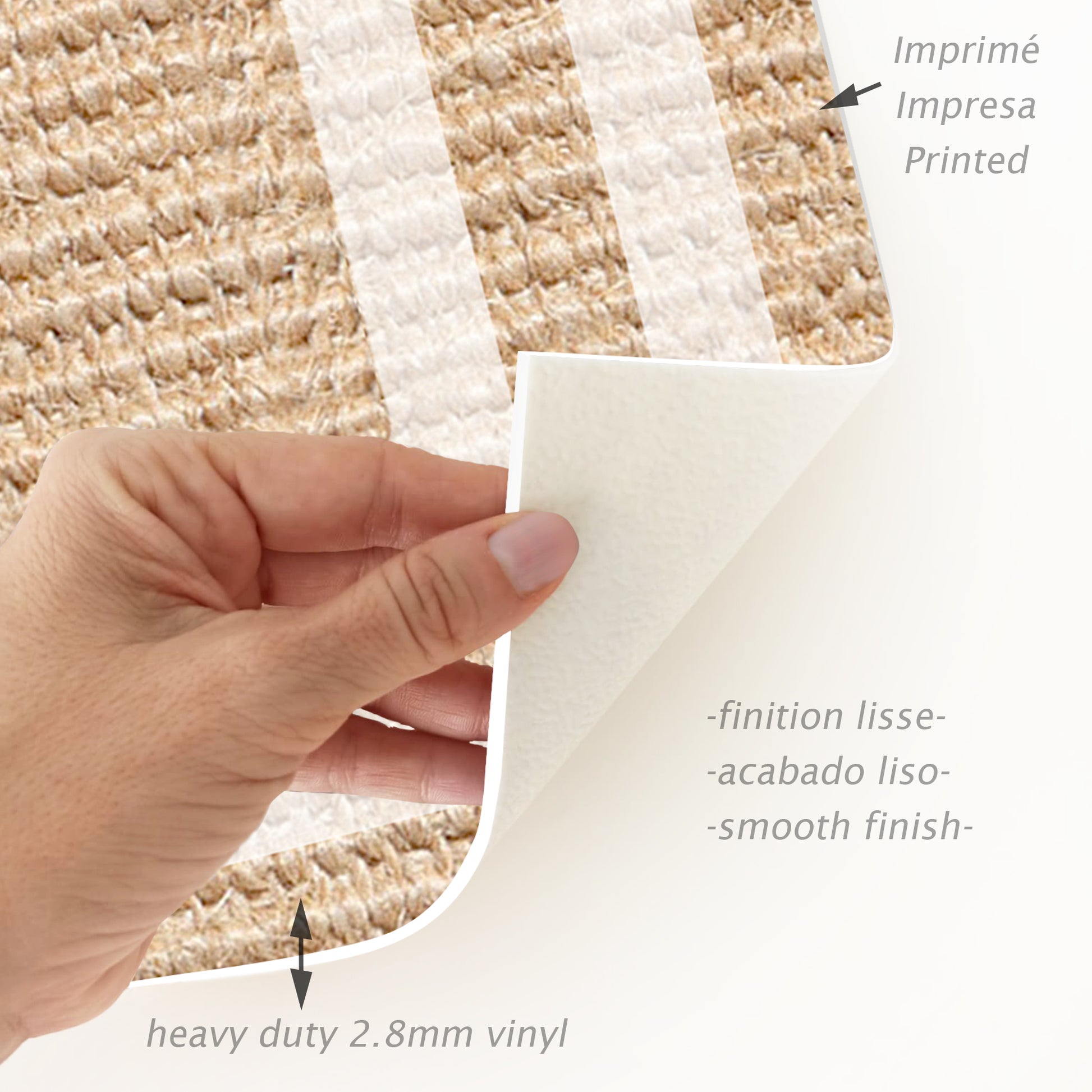 Nos tapis ne sont pas en tissu, ils sont en vinyle de haute qualité et durable. Le vinyle est une matière synthétique reconnue pour sa résistance et sa polyvalence. Contrairement aux tapis en tissu traditionnels, les tapis en vinyle offrent une impression photographique haute fidélité, recréant des textures naturelles avec une précision étonnante, comme le jute, le bois ou le marbre.