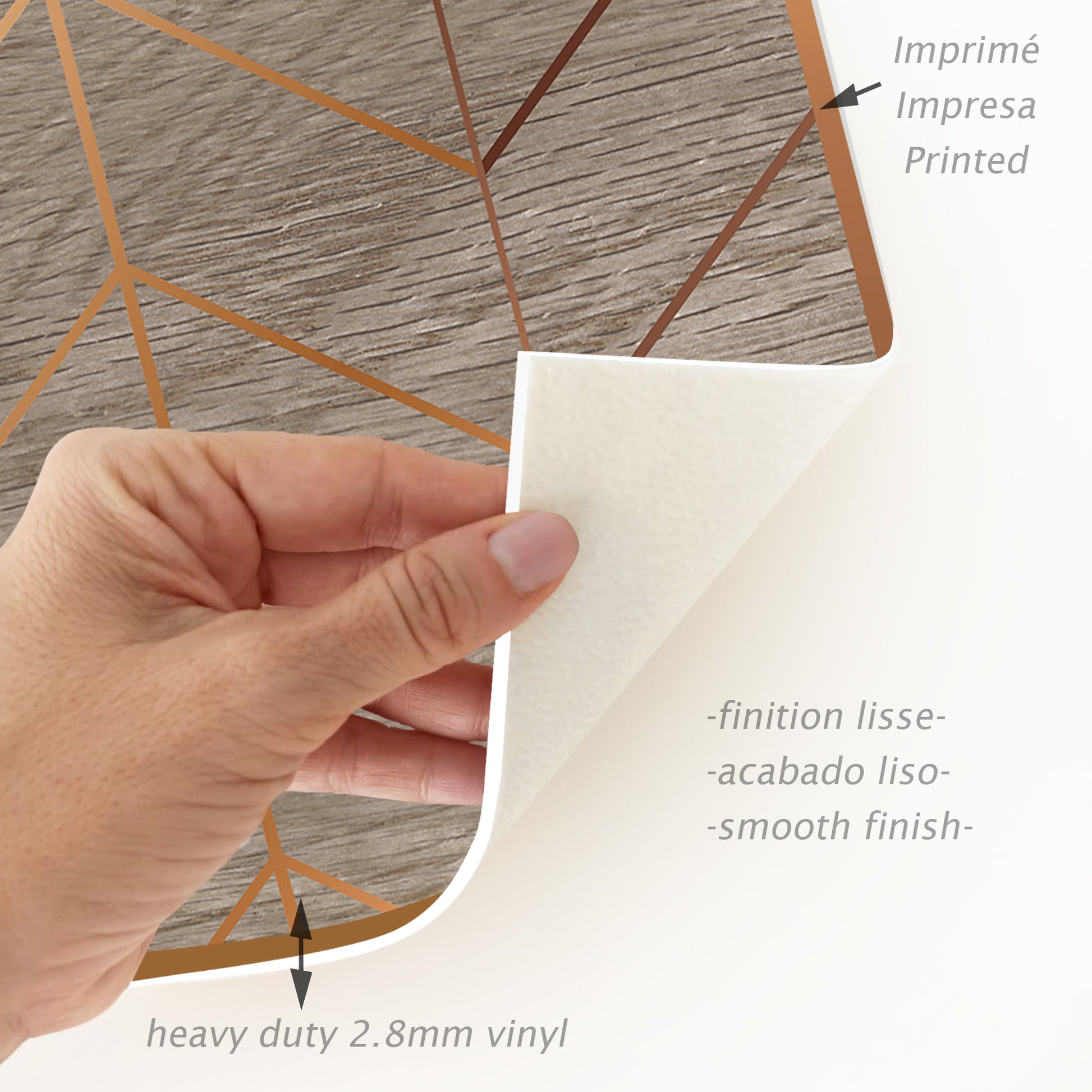 Nos tapis ne sont pas en tissu, ils sont en vinyle de haute qualité et durable. Le vinyle est une matière synthétique reconnue pour sa résistance et sa polyvalence. Contrairement aux tapis en tissu traditionnels, les tapis en vinyle offrent une impression photographique haute fidélité, recréant des textures naturelles avec une précision étonnante, comme le jute, le bois ou le marbre.