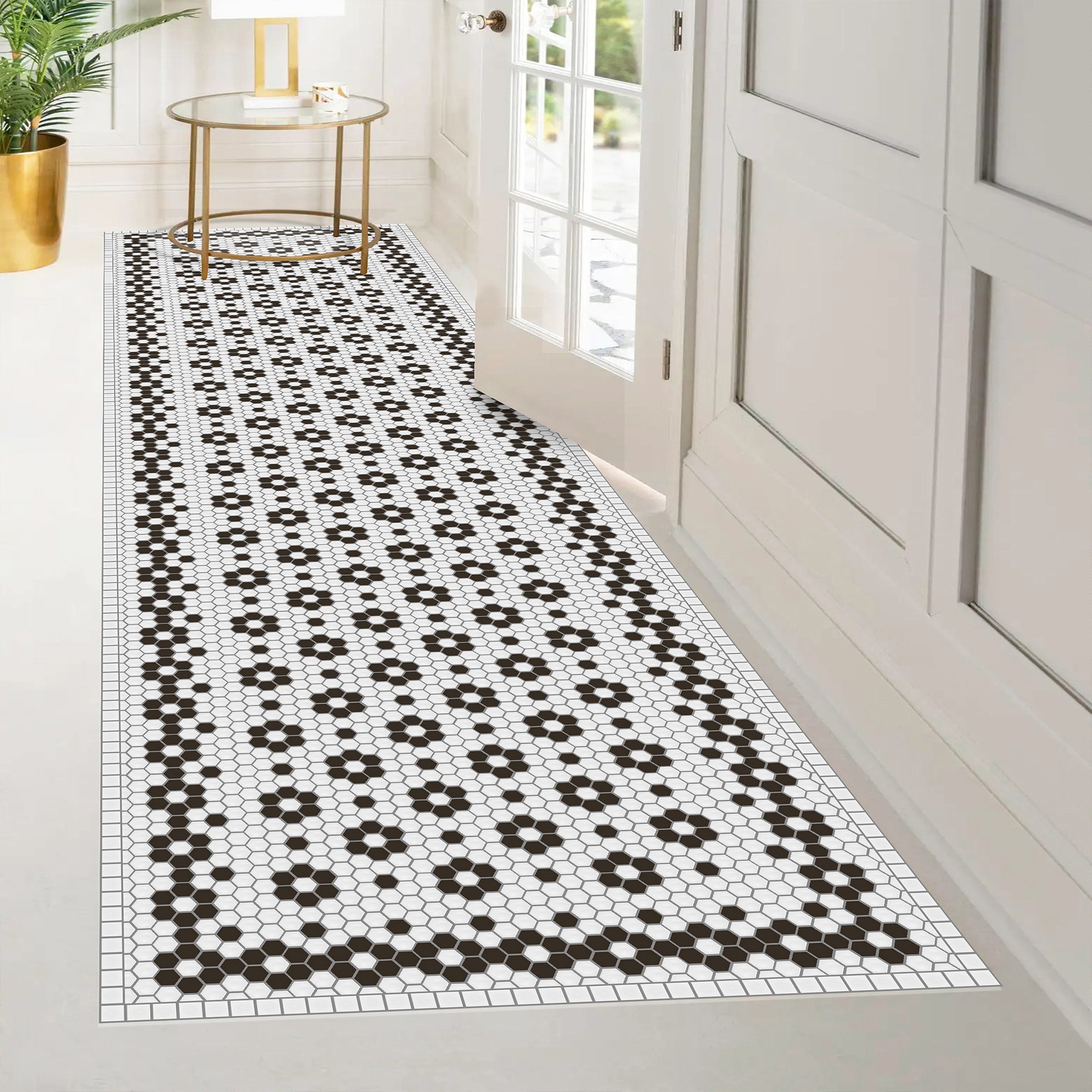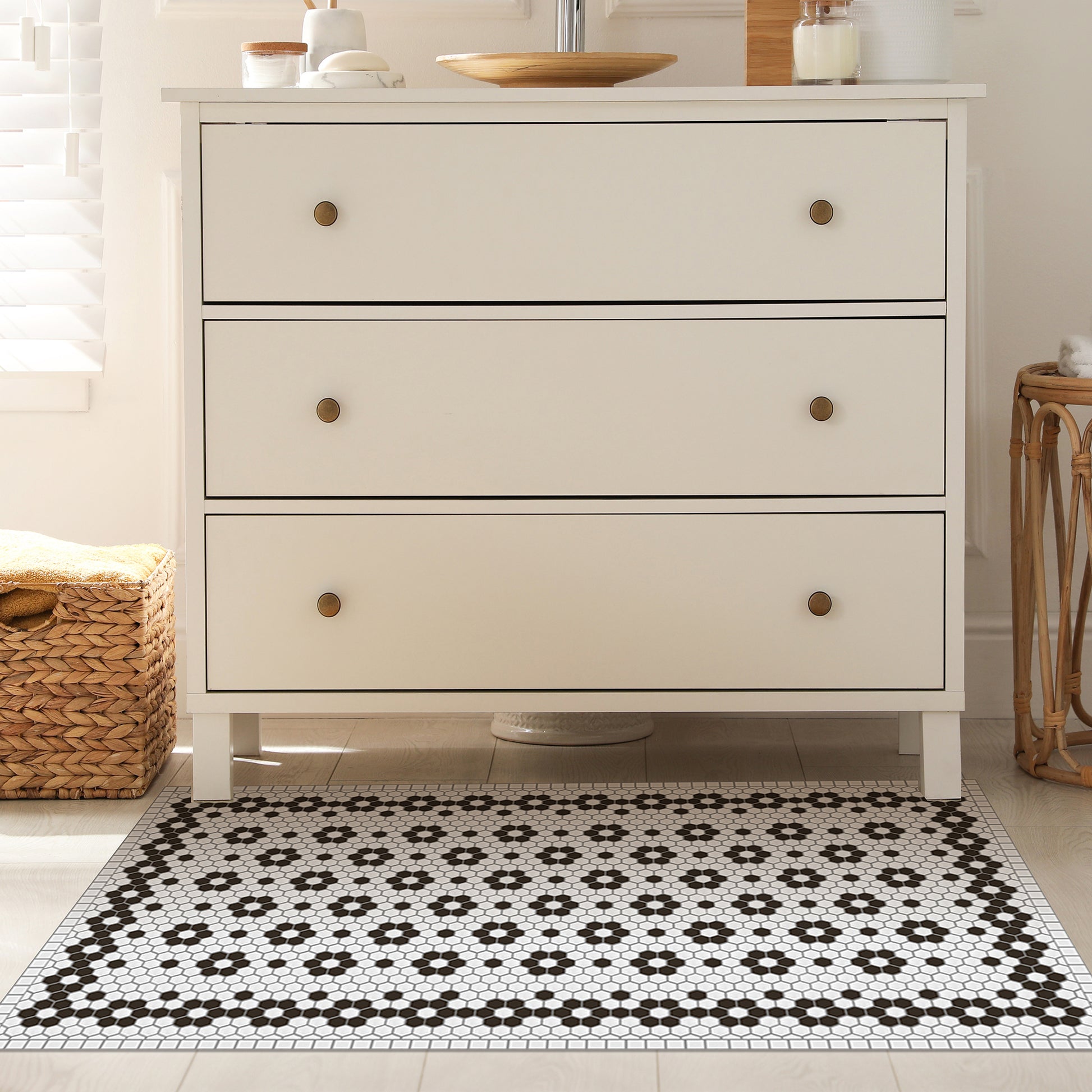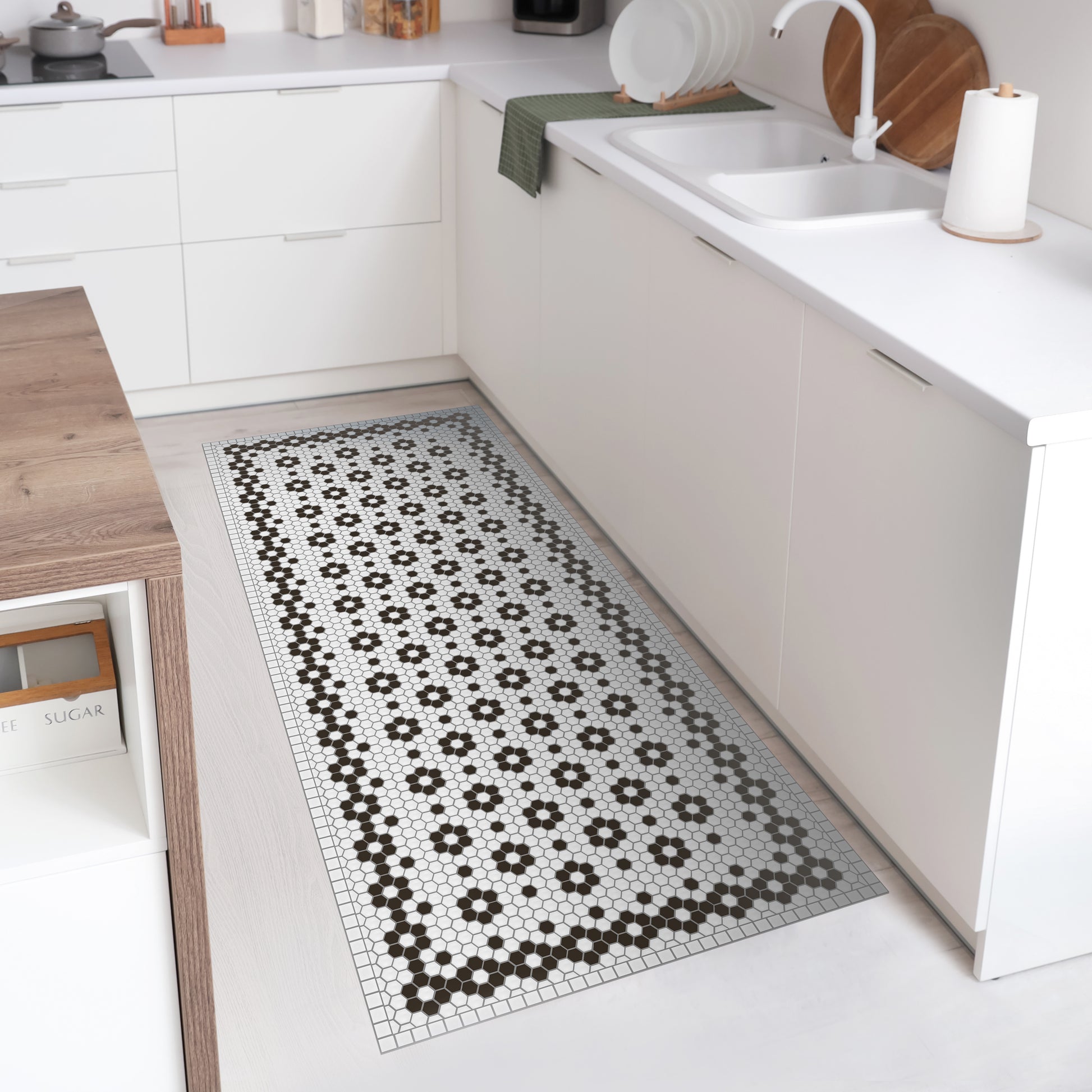 Nos tapis ne sont pas en tissu, ils sont en vinyle de haute qualité et durable. Le vinyle est une matière synthétique reconnue pour sa résistance et sa polyvalence. Contrairement aux tapis en tissu traditionnels, les tapis en vinyle offrent une impression photographique haute fidélité, recréant des textures naturelles avec une précision étonnante, comme le jute, le bois ou le marbre.
