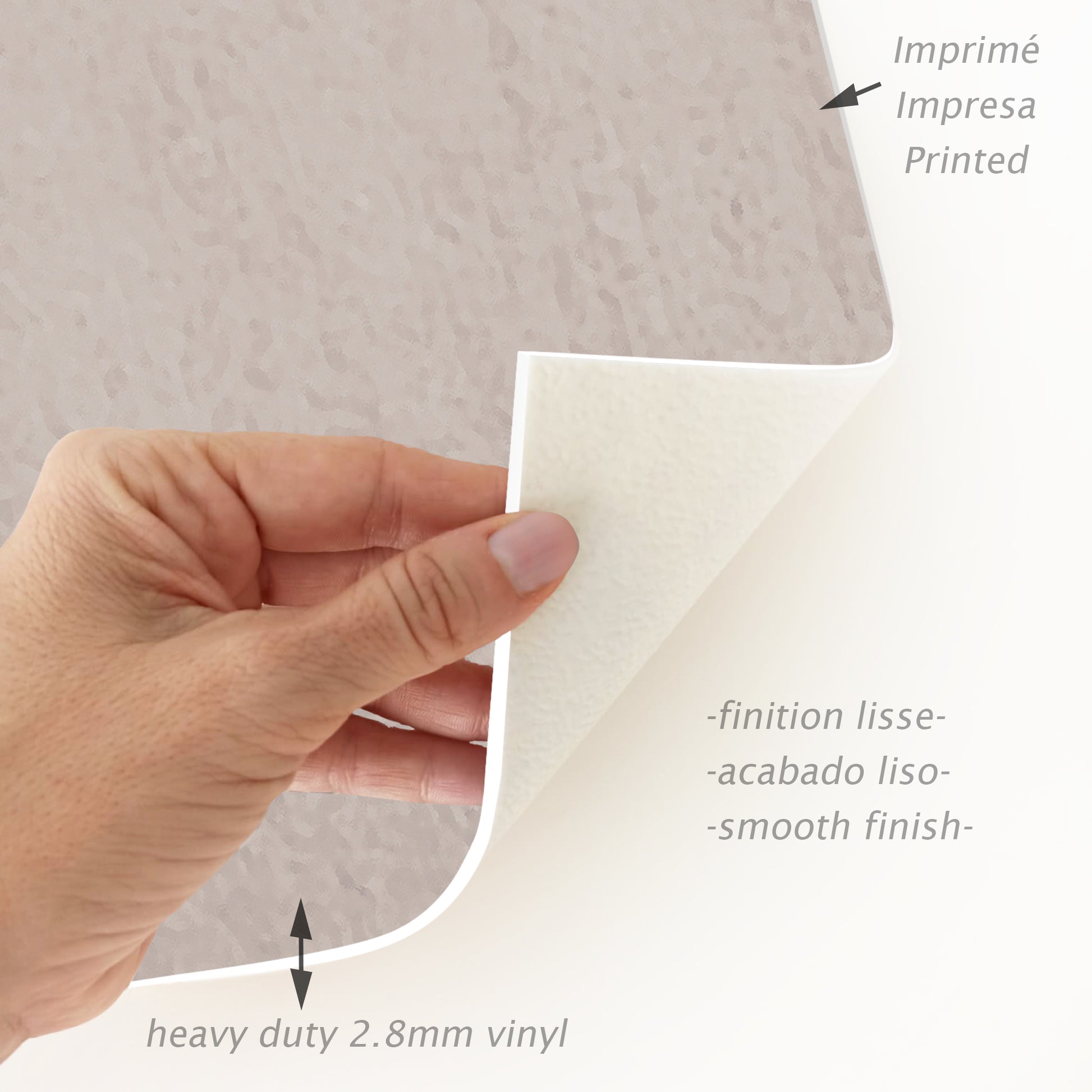 Nos tapis ne sont pas en tissu, ils sont en vinyle de haute qualité et durable. Le vinyle est une matière synthétique reconnue pour sa résistance et sa polyvalence. Contrairement aux tapis en tissu traditionnels, les tapis en vinyle offrent une impression photographique haute fidélité, recréant des textures naturelles avec une précision étonnante, comme le jute, le bois ou le marbre.