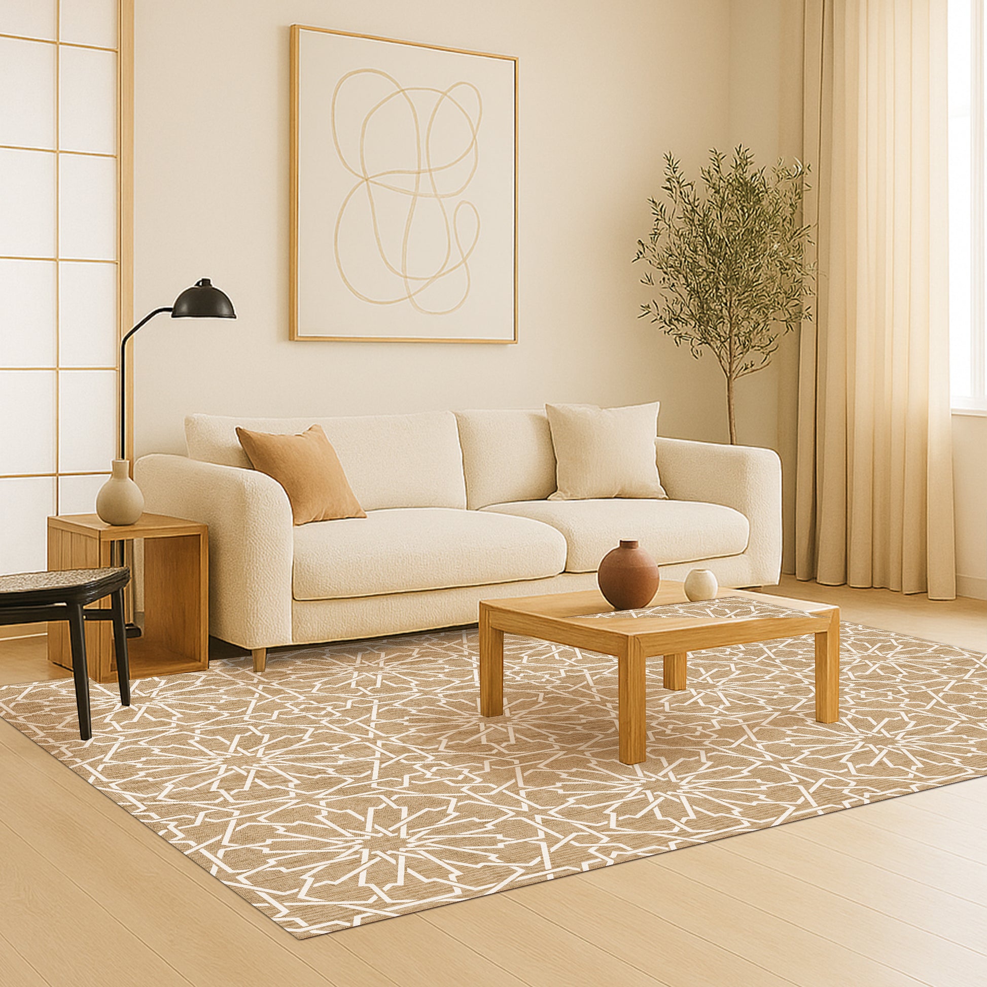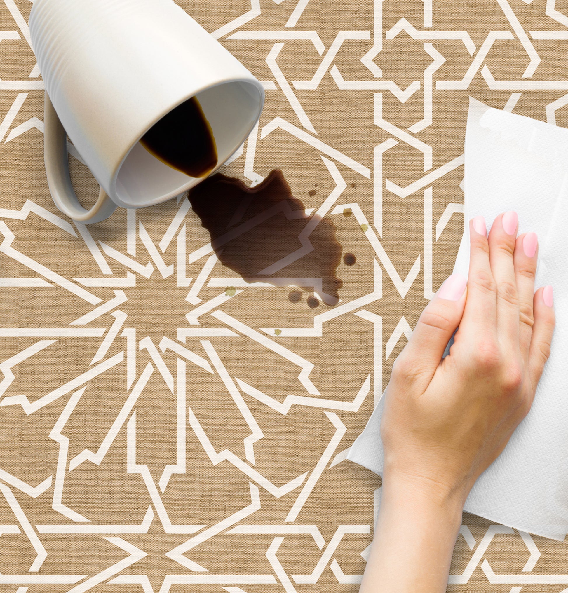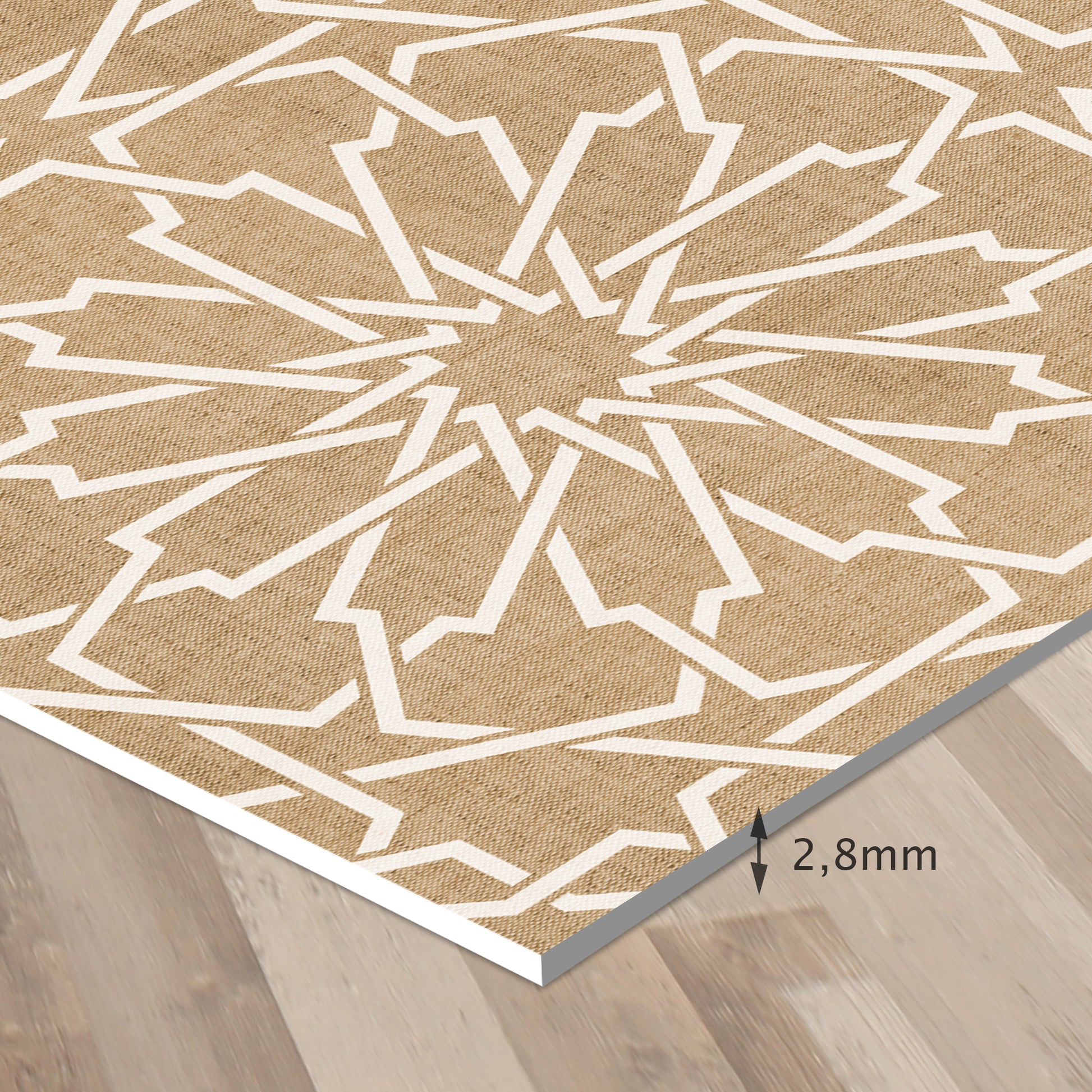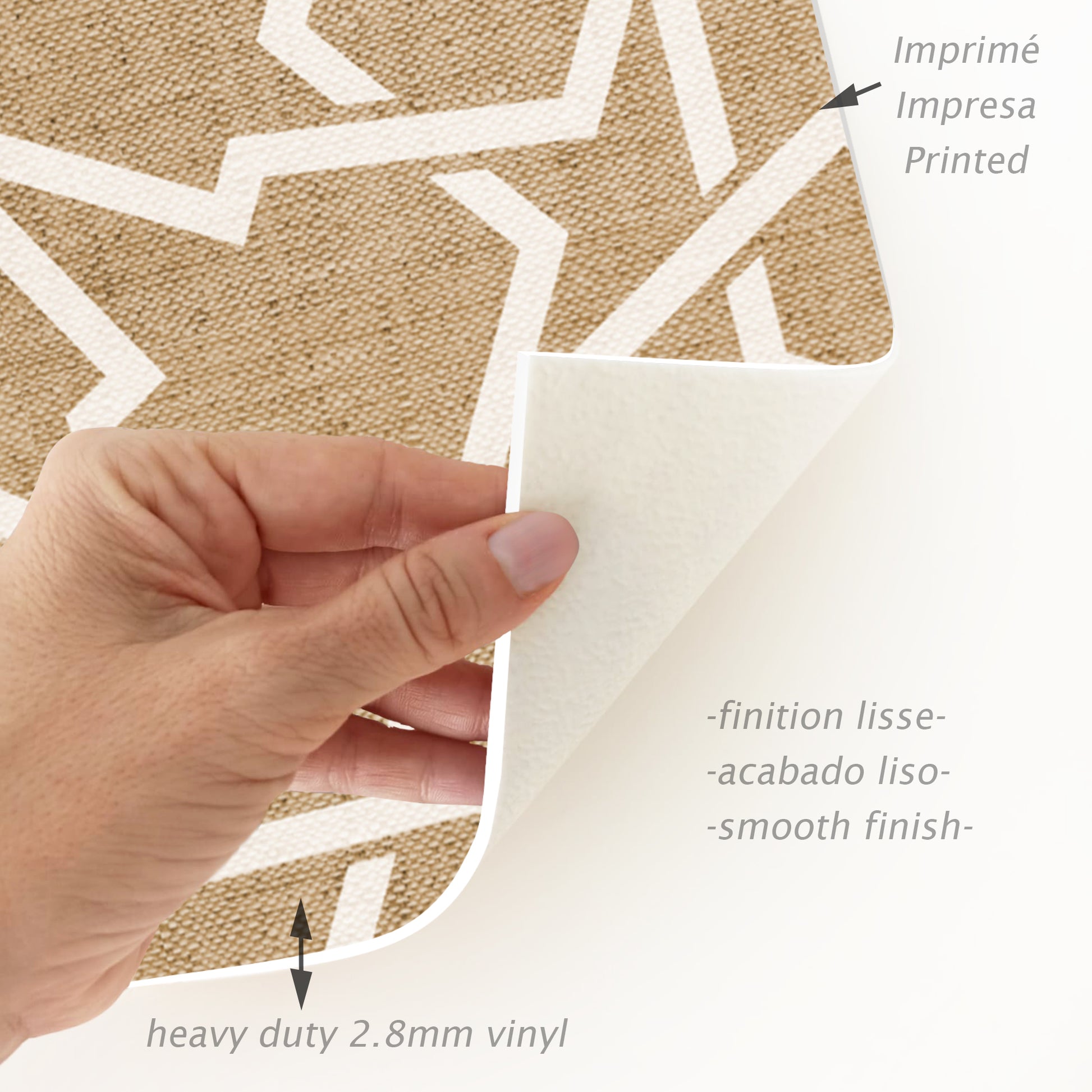 Nos tapis ne sont pas en tissu, ils sont en vinyle de haute qualité et durable. Le vinyle est une matière synthétique reconnue pour sa résistance et sa polyvalence. Contrairement aux tapis en tissu traditionnels, les tapis en vinyle offrent une impression photographique haute fidélité, recréant des textures naturelles avec une précision étonnante, comme le jute, le bois ou le marbre.