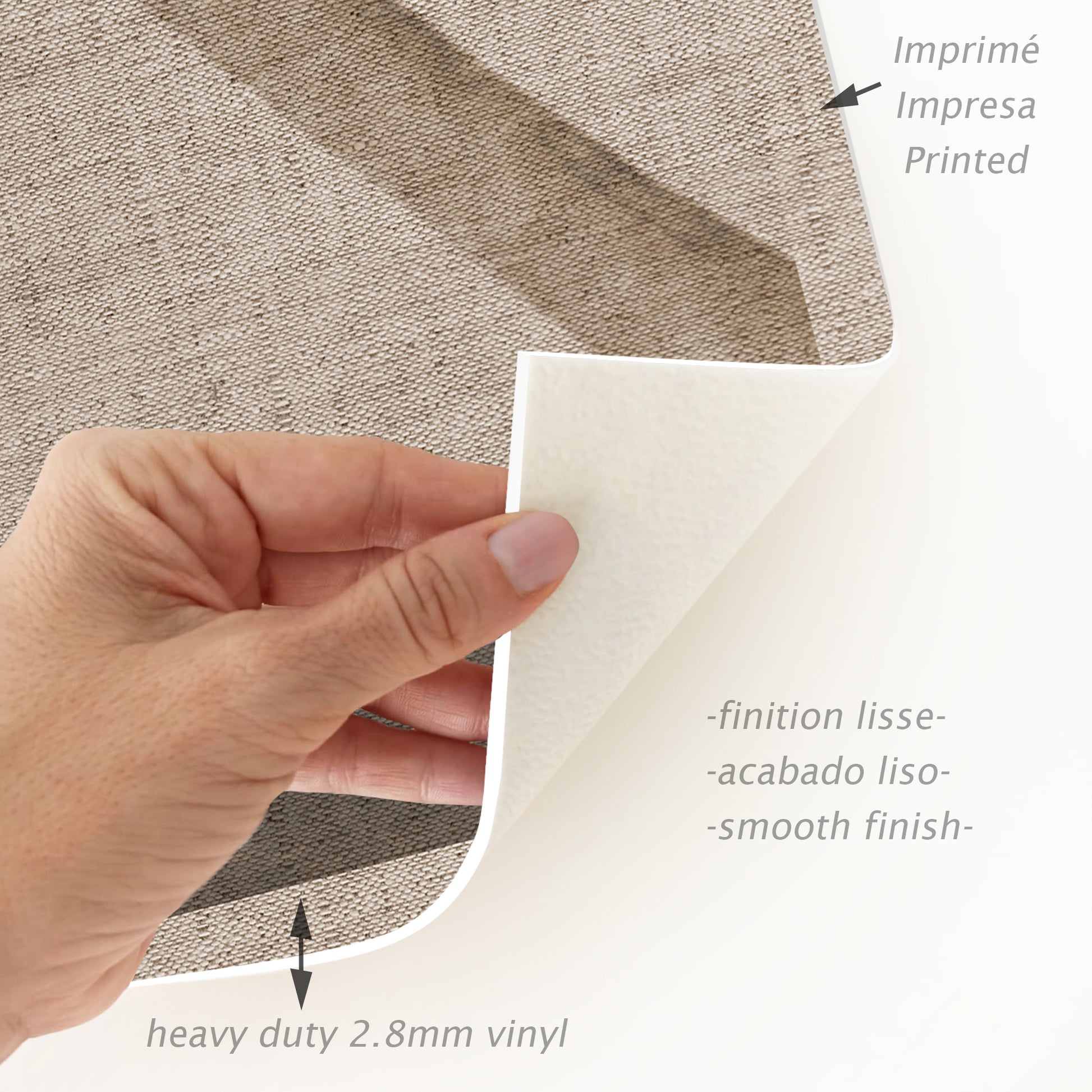 Nos tapis ne sont pas en tissu, ils sont en vinyle de haute qualité et durable. Le vinyle est une matière synthétique reconnue pour sa résistance et sa polyvalence. Contrairement aux tapis en tissu traditionnels, les tapis en vinyle offrent une impression photographique haute fidélité, recréant des textures naturelles avec une précision étonnante, comme le jute, le bois ou le marbre.