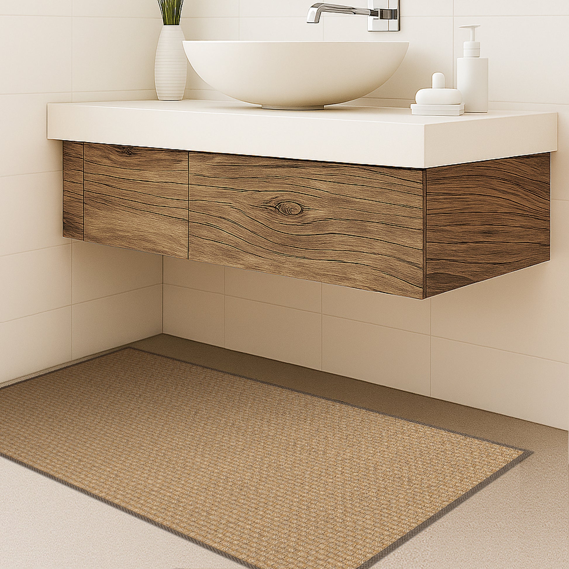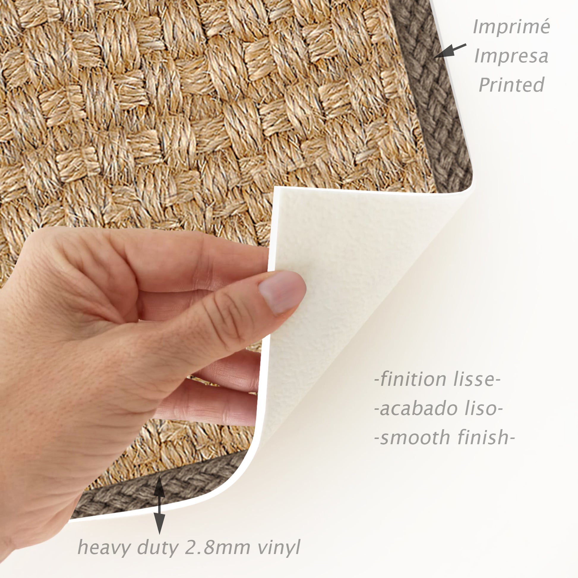 Nos tapis ne sont pas en tissu, ils sont en vinyle de haute qualité et durable. Le vinyle est une matière synthétique reconnue pour sa résistance et sa polyvalence. Contrairement aux tapis en tissu traditionnels, les tapis en vinyle offrent une impression photographique haute fidélité, recréant des textures naturelles avec une précision étonnante, comme le jute, le bois ou le marbre.