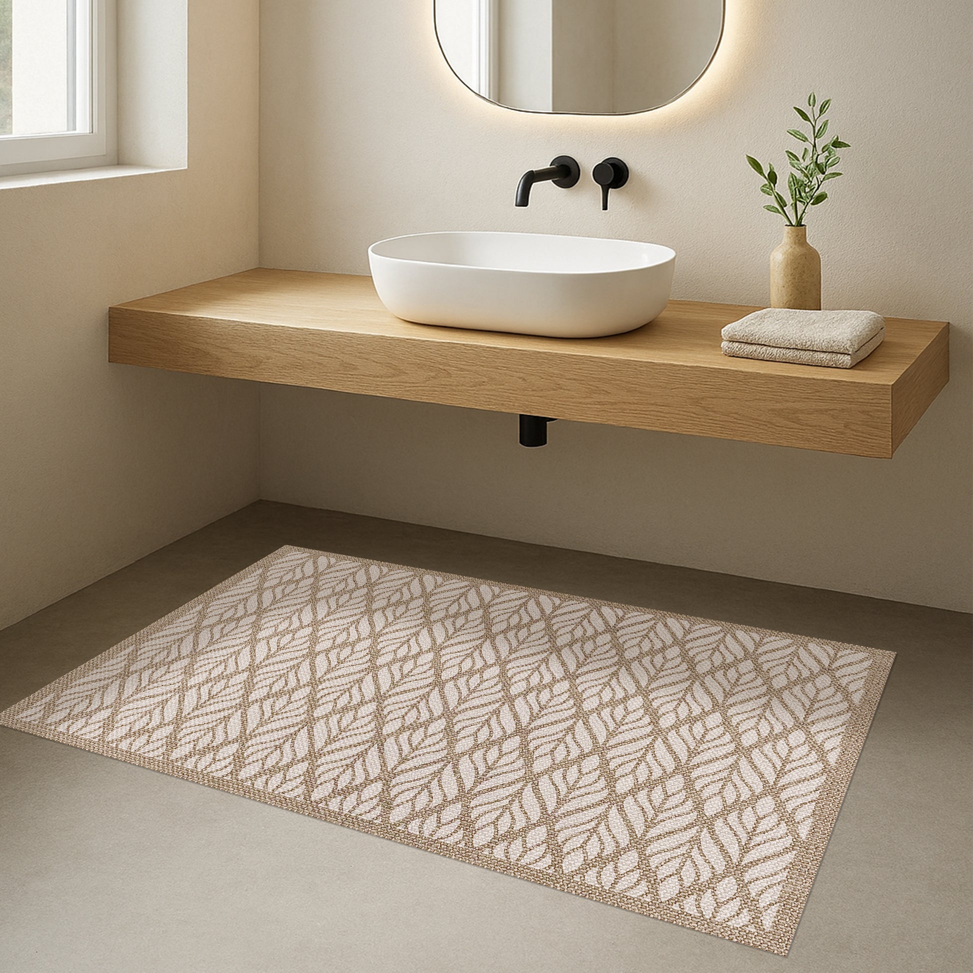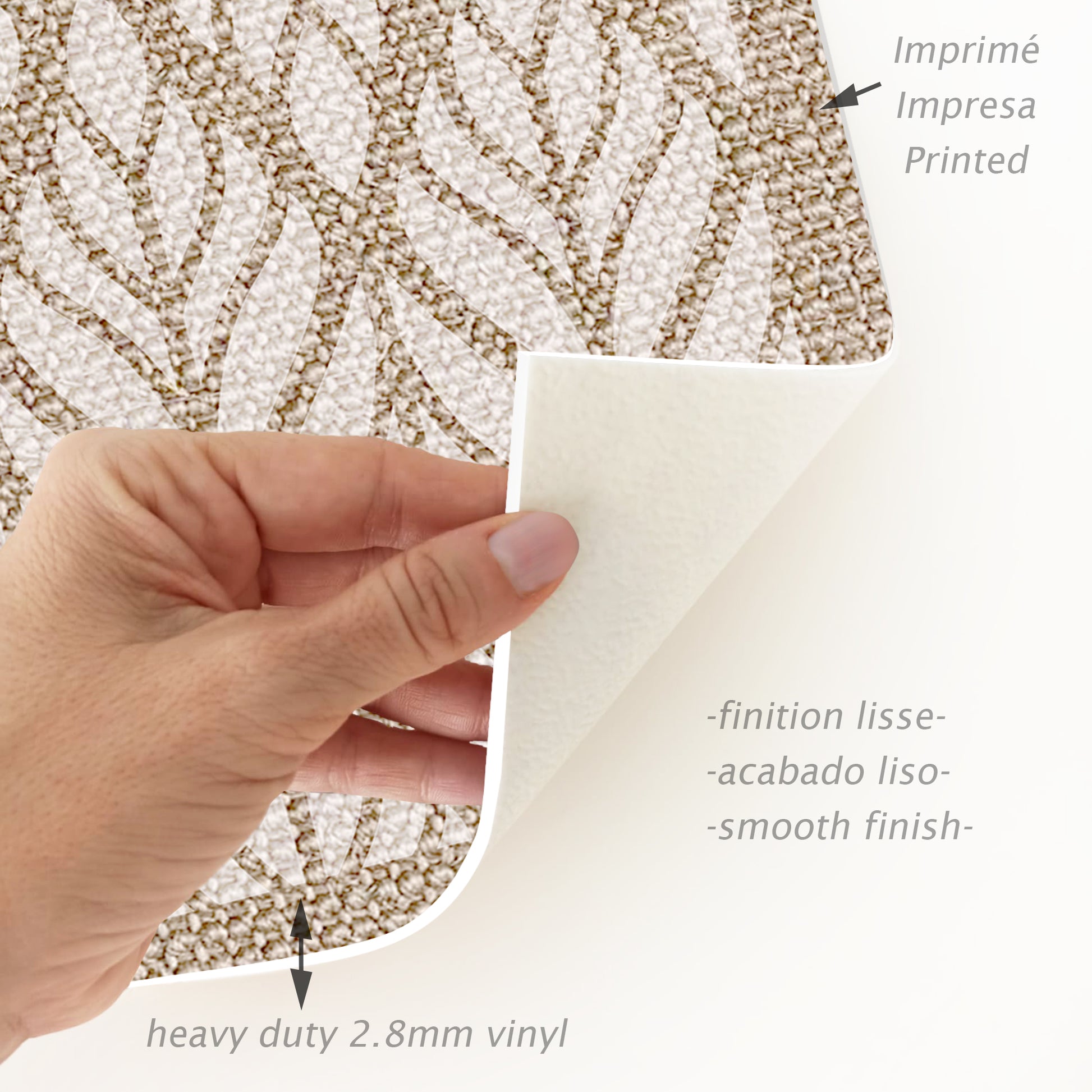 Nos tapis ne sont pas en tissu, ils sont en vinyle de haute qualité et durable. Le vinyle est une matière synthétique reconnue pour sa résistance et sa polyvalence. Contrairement aux tapis en tissu traditionnels, les tapis en vinyle offrent une impression photographique haute fidélité, recréant des textures naturelles avec une précision étonnante, comme le jute, le bois ou le marbre.
