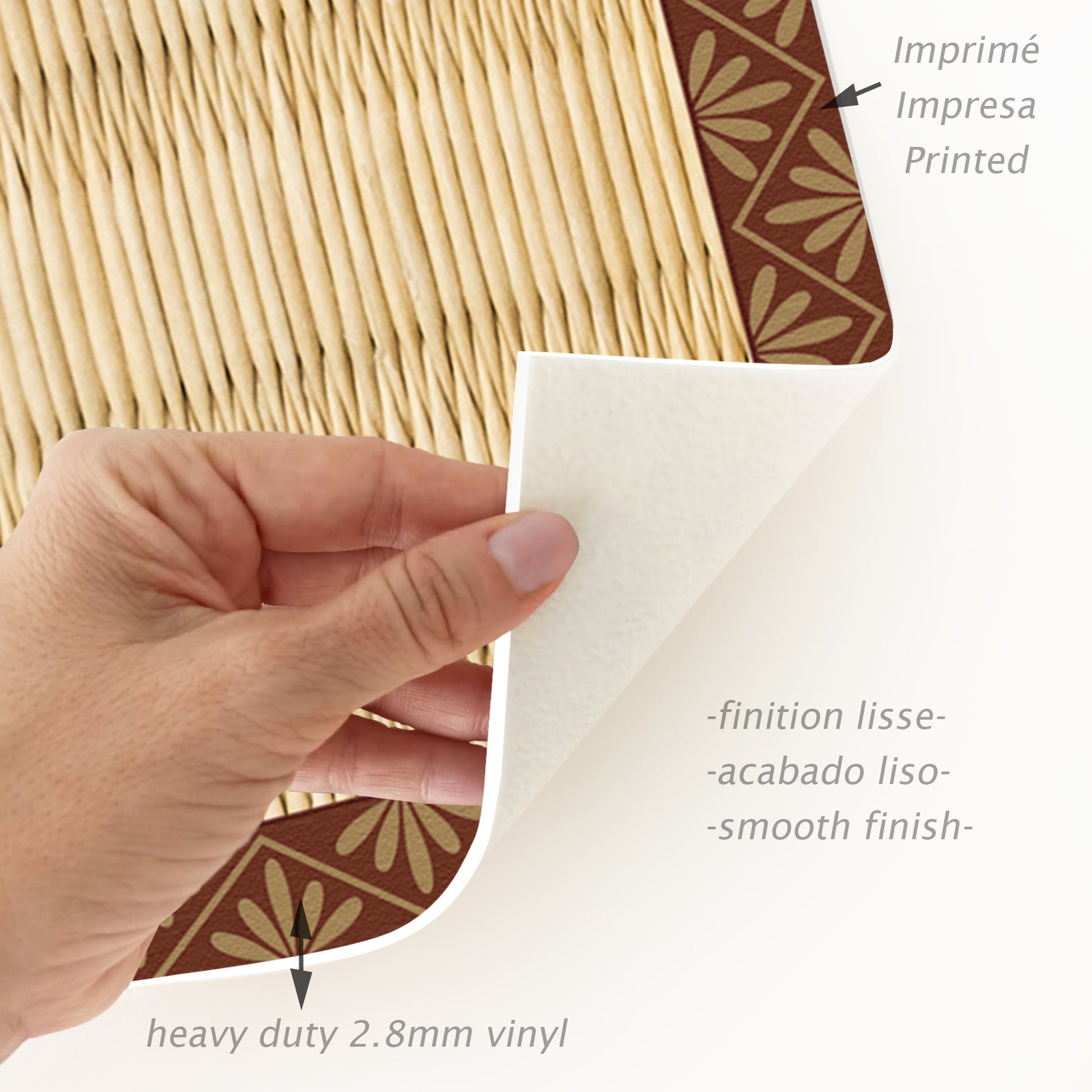 Nos tapis ne sont pas en tissu, ils sont en vinyle de haute qualité et durable. Le vinyle est une matière synthétique reconnue pour sa résistance et sa polyvalence. Contrairement aux tapis en tissu traditionnels, les tapis en vinyle offrent une impression photographique haute fidélité, recréant des textures naturelles avec une précision étonnante, comme le jute, le bois ou le marbre.