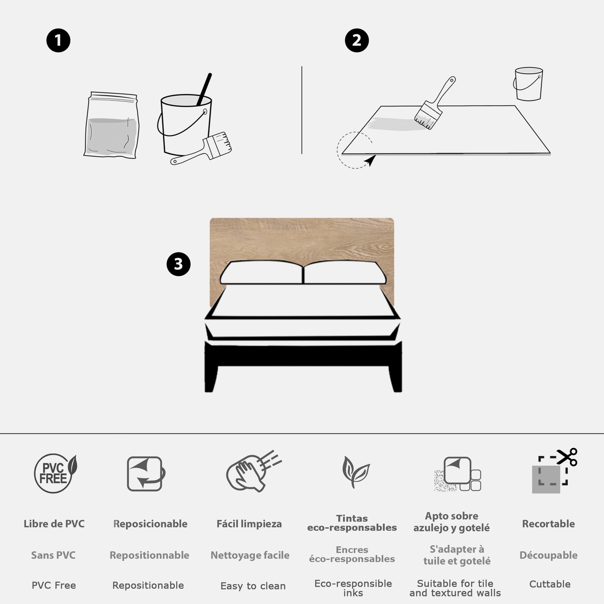 Tête de lit en vinyle pour murs lisses ou rugueux (gotelé). Matériau résistant, sans phtalates et ignifuge. La colle est incluse pour le placement sur le mur.