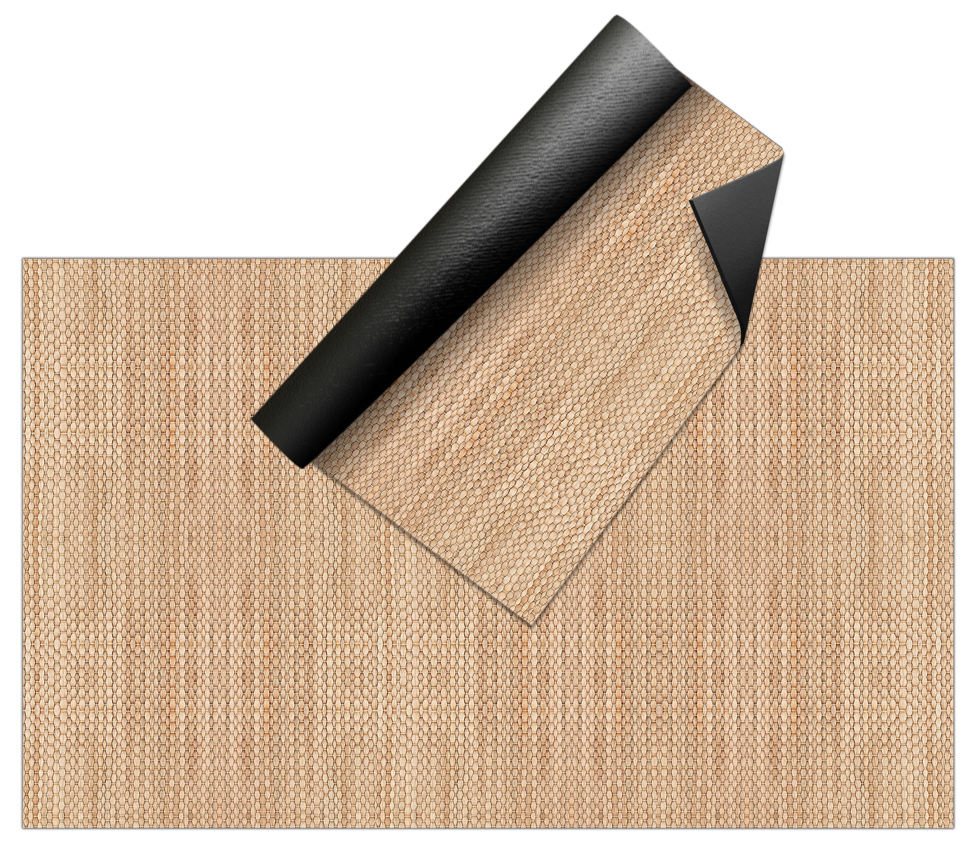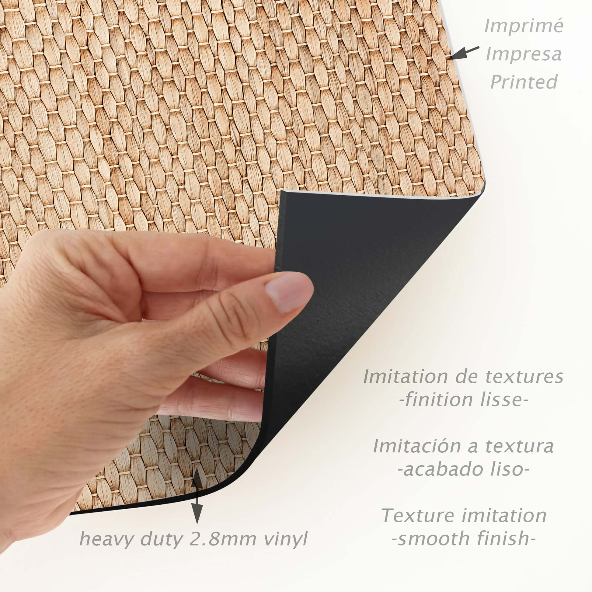 Nos tapis ne sont pas en tissu, ils sont en vinyle de haute qualité et durable. Le vinyle est une matière synthétique reconnue pour sa résistance et sa polyvalence. Contrairement aux tapis en tissu traditionnels, les tapis en vinyle offrent une impression photographique haute fidélité, recréant des textures naturelles avec une précision étonnante, comme le jute, le bois ou le marbre.