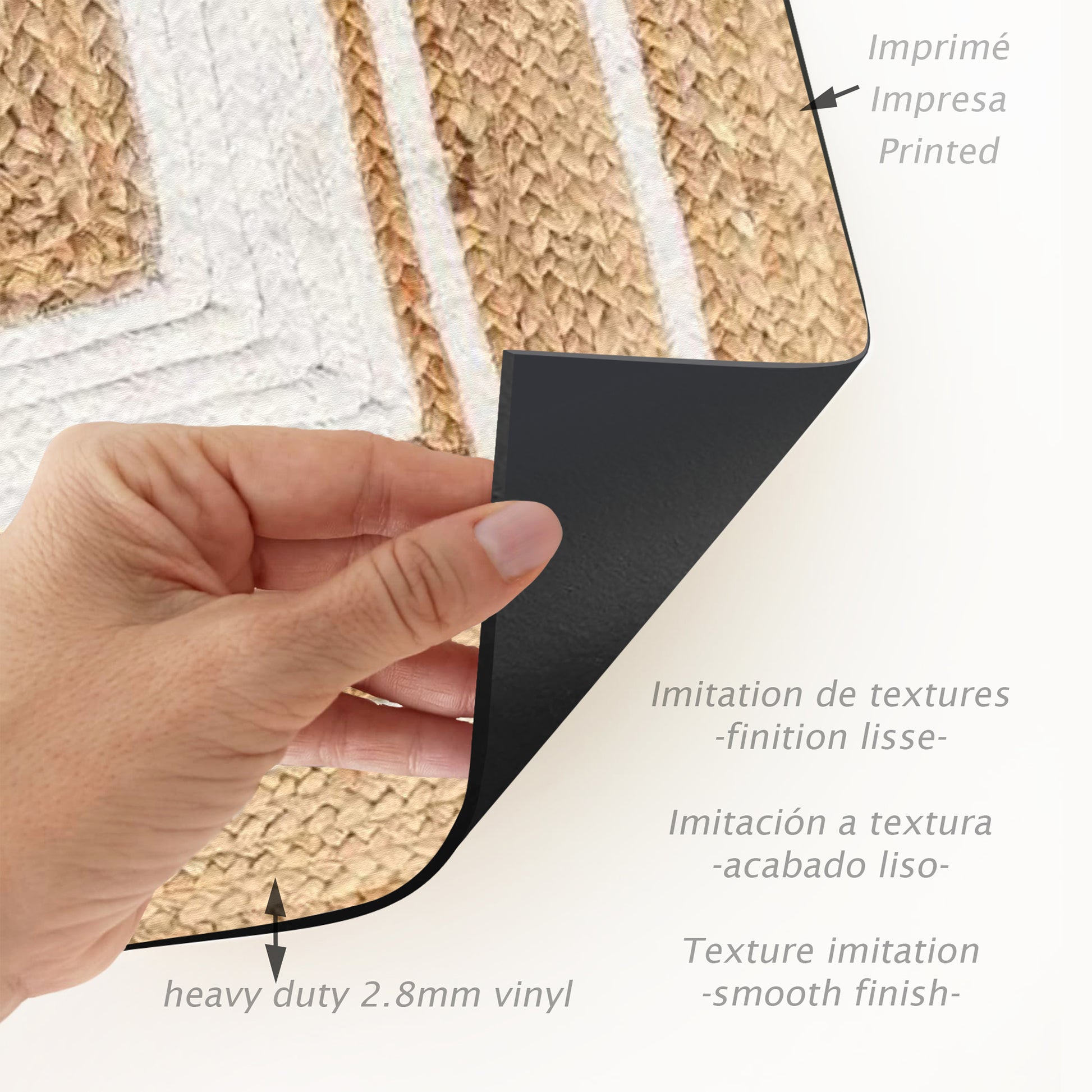 Nos tapis ne sont pas en tissu, ils sont en vinyle de haute qualité et durable. Le vinyle est une matière synthétique reconnue pour sa résistance et sa polyvalence. Contrairement aux tapis en tissu traditionnels, les tapis en vinyle offrent une impression photographique haute fidélité, recréant des textures naturelles avec une précision étonnante, comme le jute, le bois ou le marbre.