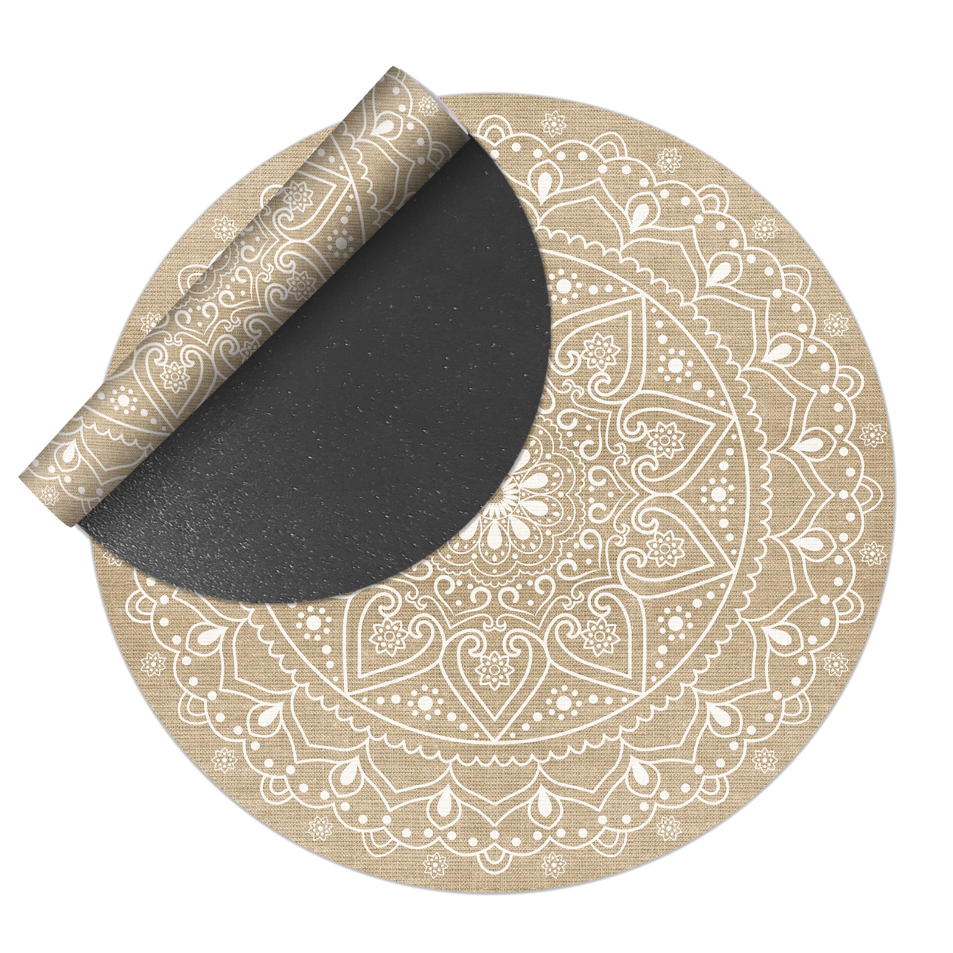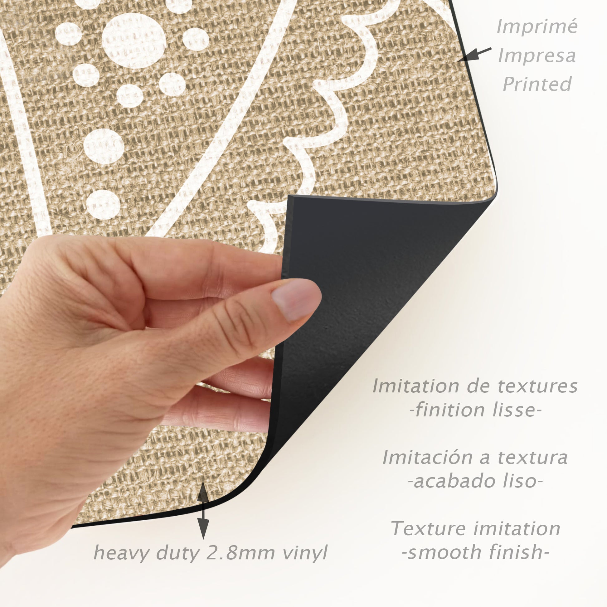 Nos tapis ne sont pas en tissu, ils sont en vinyle de haute qualité et durable. Le vinyle est une matière synthétique reconnue pour sa résistance et sa polyvalence. Contrairement aux tapis en tissu traditionnels, les tapis en vinyle offrent une impression photographique haute fidélité, recréant des textures naturelles avec une précision étonnante, comme le jute, le bois ou le marbre.