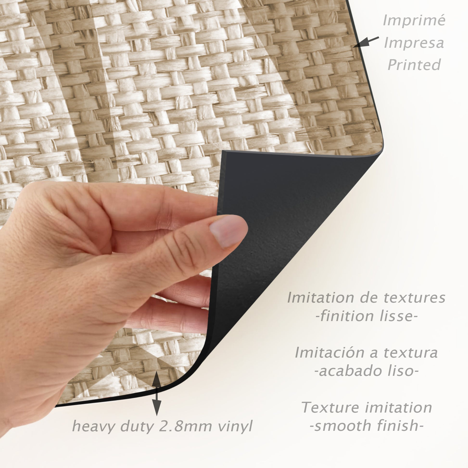 Nos tapis ne sont pas en tissu, ils sont en vinyle de haute qualité et durable. Le vinyle est une matière synthétique reconnue pour sa résistance et sa polyvalence. Contrairement aux tapis en tissu traditionnels, les tapis en vinyle offrent une impression photographique haute fidélité, recréant des textures naturelles avec une précision étonnante, comme le jute, le bois ou le marbre.