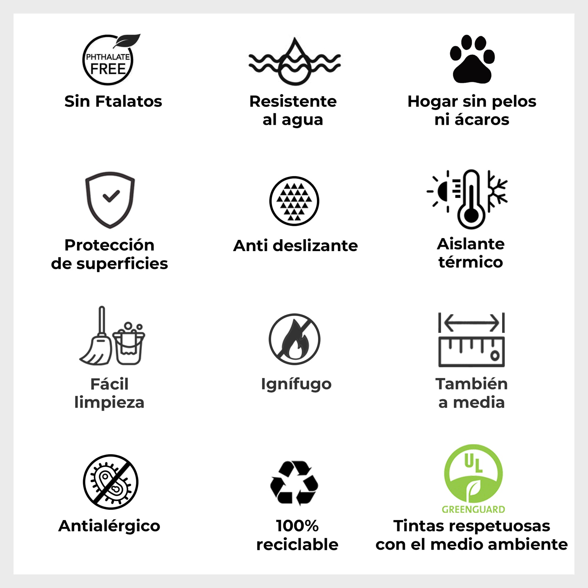 • Le matériau est antidérapant, hypoallergénique, antimicrobien, imperméable, isolant thermique et ignifuge. Il est exempt de phtalates et de BPA et imprimé avec des encres durables, contribuant ainsi à une maison plus sûre et sans produits toxiques.