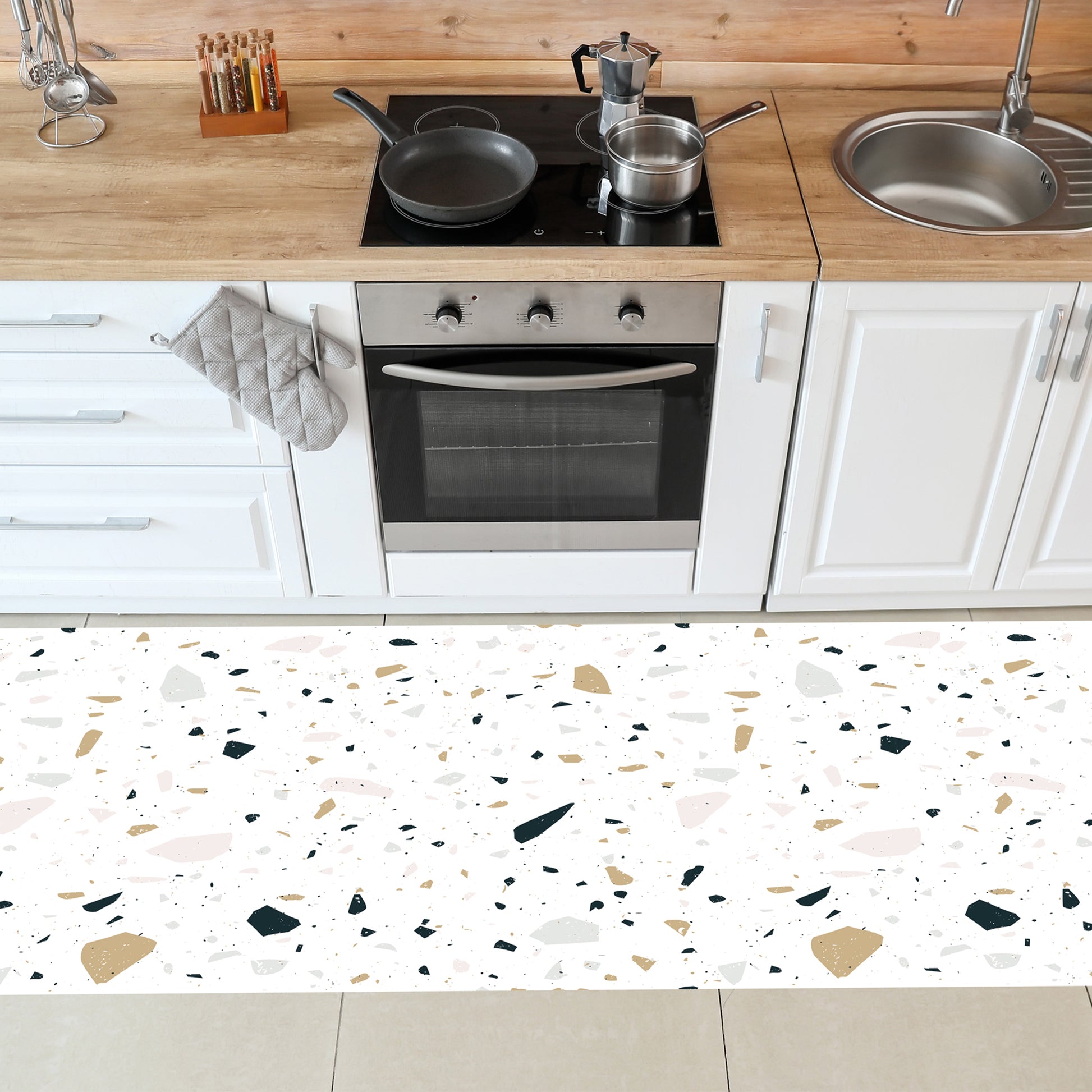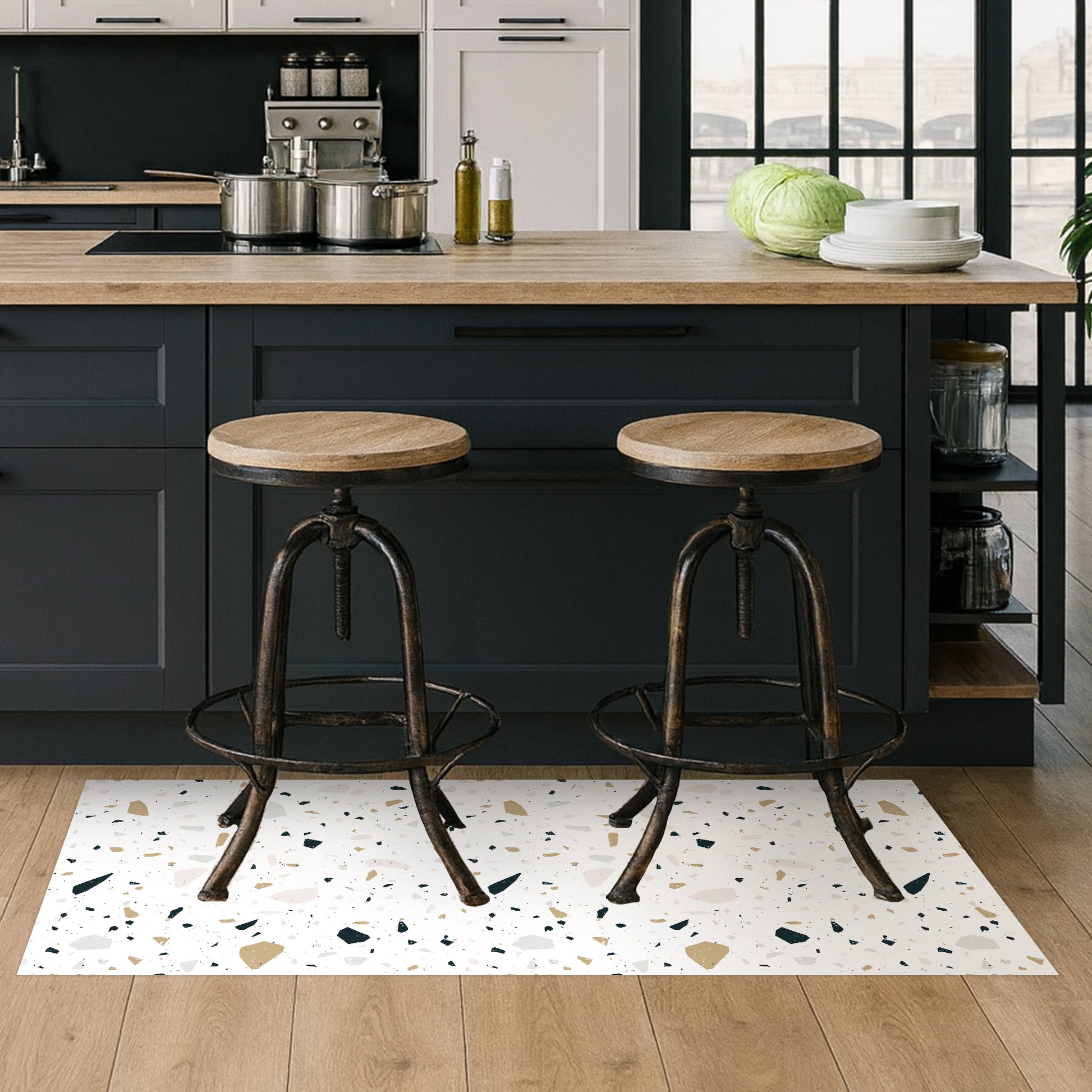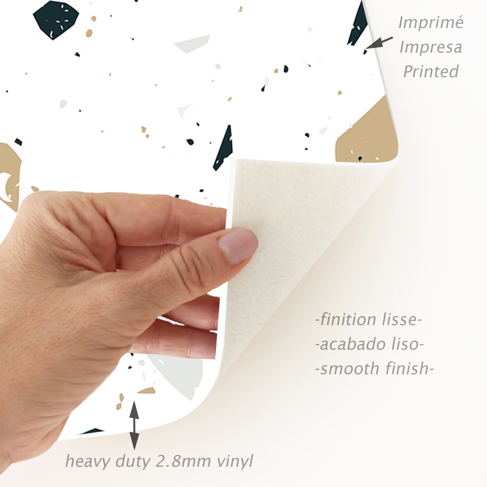 Nos tapis ne sont pas en tissu, ils sont en vinyle de haute qualité et durable. Le vinyle est une matière synthétique reconnue pour sa résistance et sa polyvalence. Contrairement aux tapis en tissu traditionnels, les tapis en vinyle offrent une impression photographique haute fidélité, recréant des textures naturelles avec une précision étonnante, comme le jute, le bois ou le marbre.