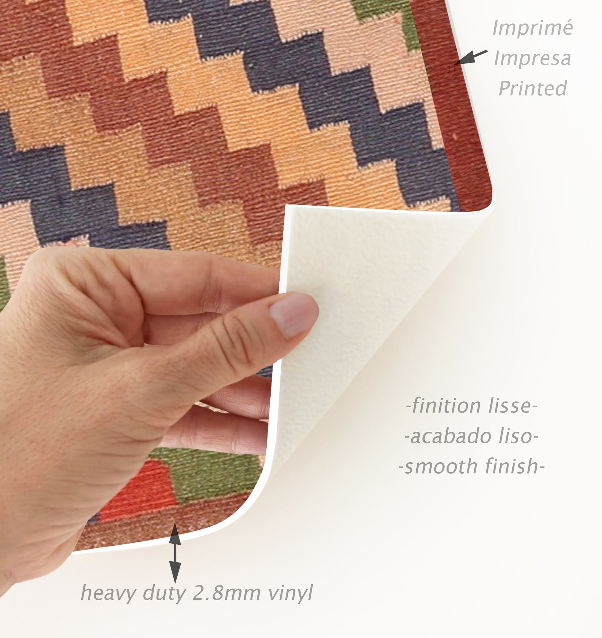 Nos tapis ne sont pas en tissu, ils sont en vinyle de haute qualité et durable. Le vinyle est une matière synthétique reconnue pour sa résistance et sa polyvalence. Contrairement aux tapis en tissu traditionnels, les tapis en vinyle offrent une impression photographique haute fidélité, recréant des textures naturelles avec une précision étonnante, comme le jute, le bois ou le marbre.