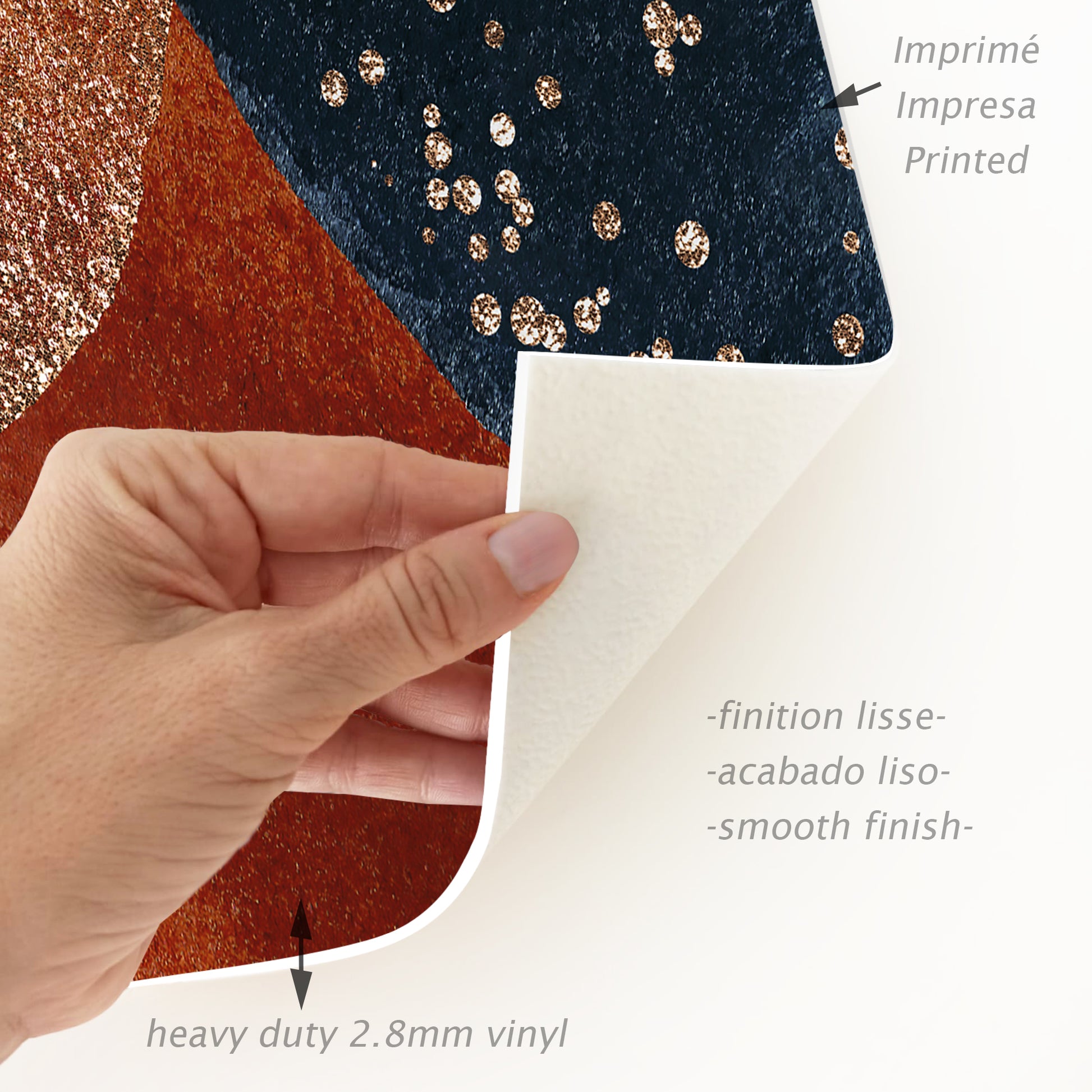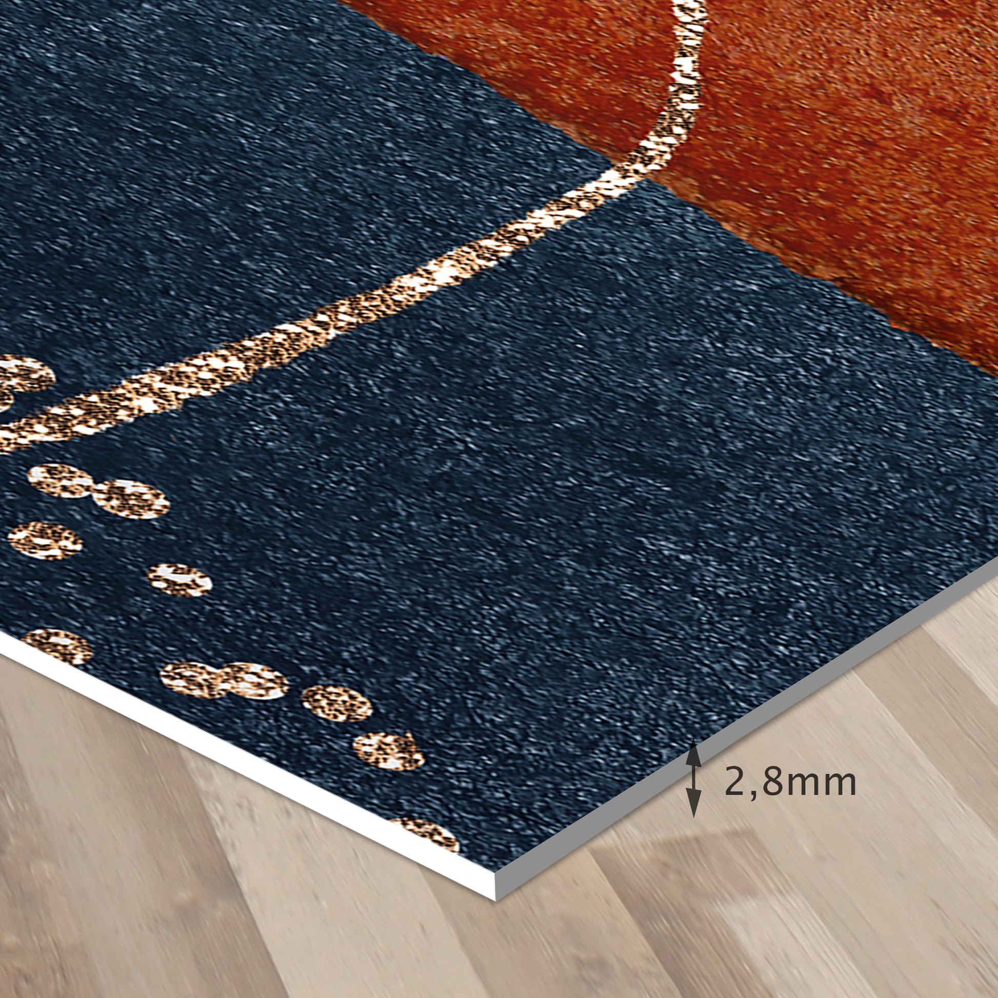 Nuestras alfombras no son de tela, son de vinilo de alta calidad y durabilidad. El vinilo es un material sintético conocido por su resistencia y versatilidad. A diferencia de las alfombras tradicionales de tela, las alfombras de vinilo ofrecen una impresión fotográfica de alta fidelidad, recreando texturas naturales con una precisión asombrosa, como el yute, la madera o el mármol.