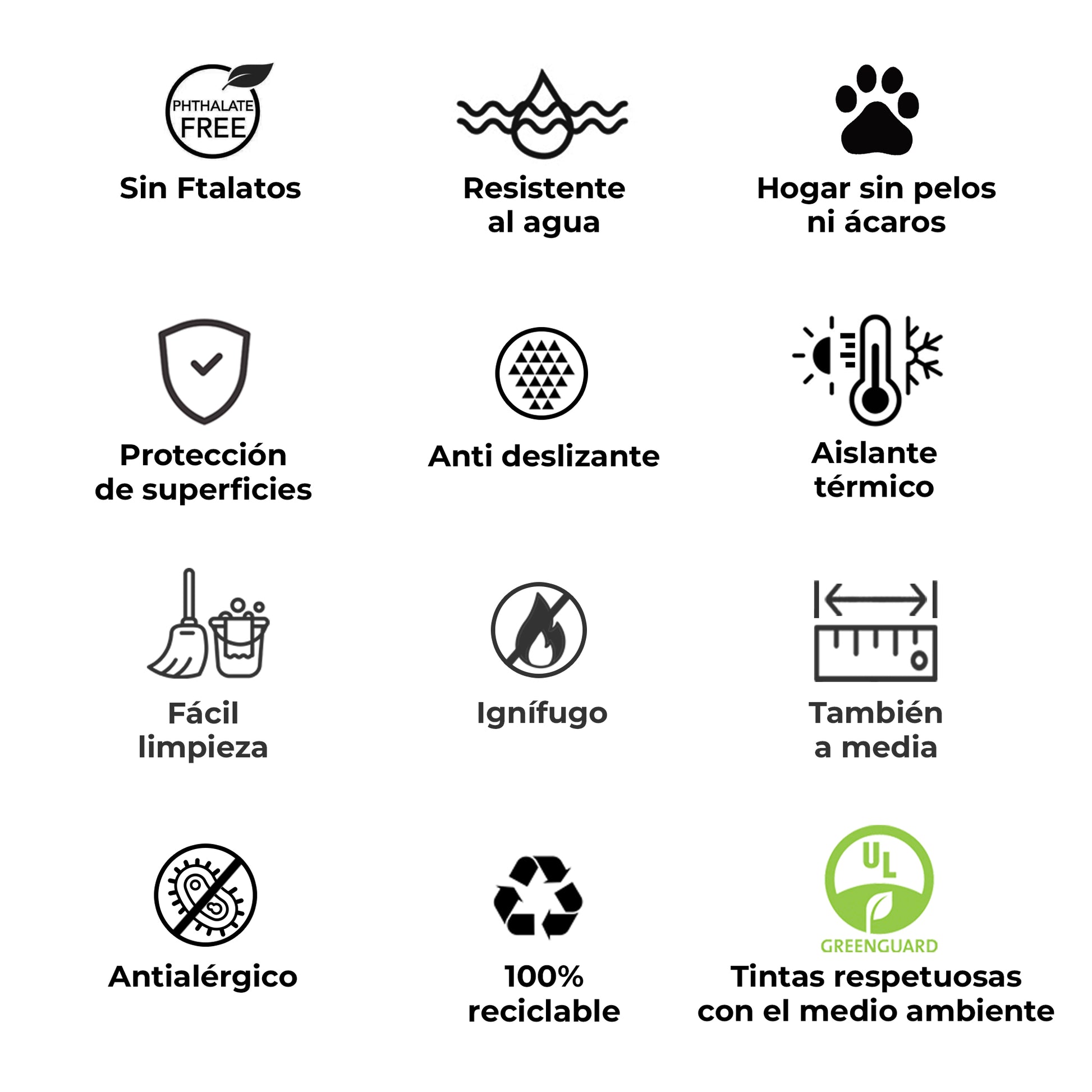 • El material es antideslizante, hipoalergénico, antimicrobiano, impermeable, aislante térmico e ignífugo. Está libre de ftalatos y BPA e impresas con tintas sostenibles contribuyendo a un hogar más seguro y libre de tóxicos.